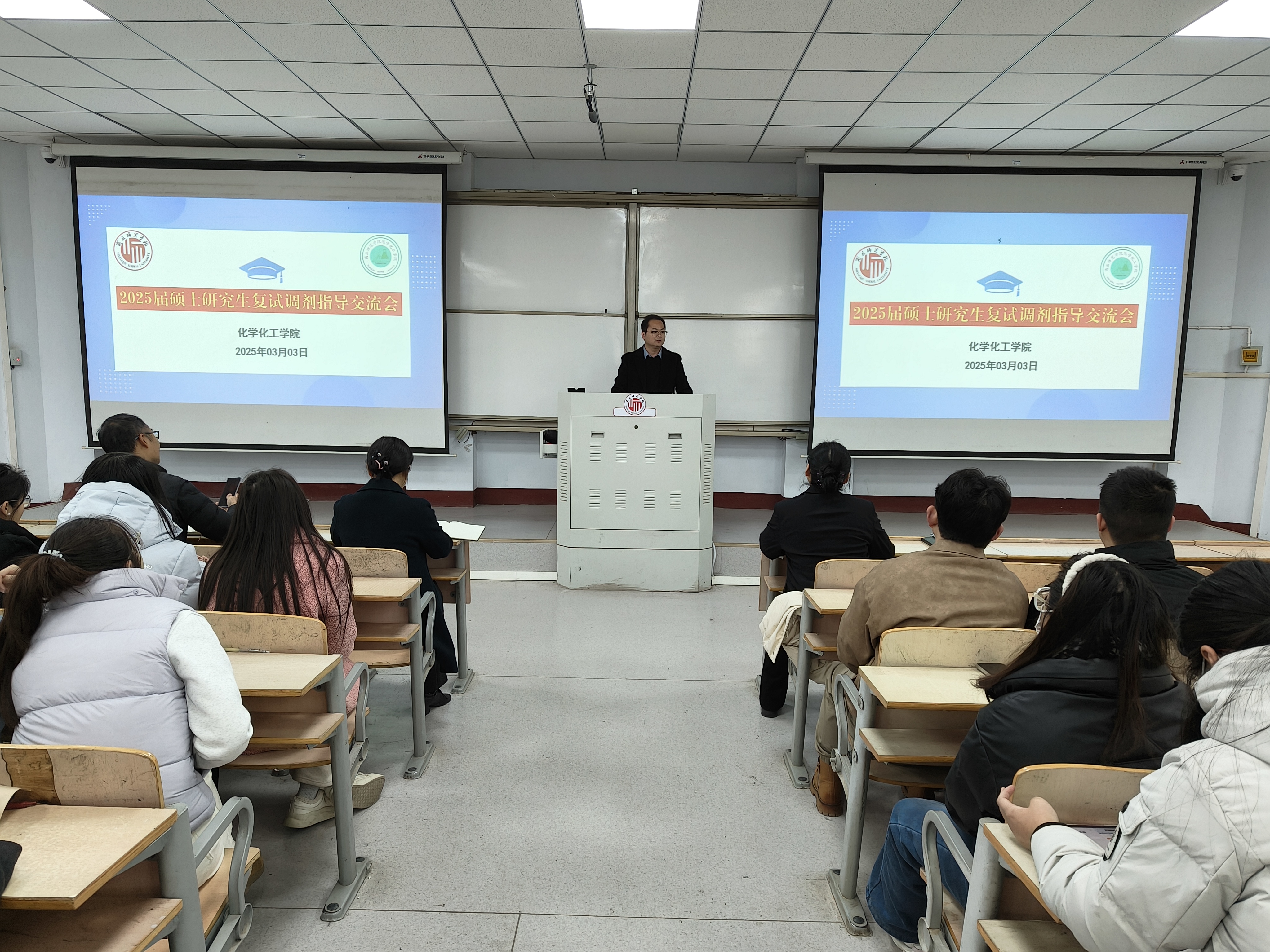 为全力做好学生考研复试、调剂等各项服务保障工作,帮助学生更好地了解复试、调剂要点,提高考研录取率,化学化工学院于3月3日在睢阳校区1号教学楼307教室举办了2025年硕士研究生复试调剂指导交流会。学院领导班子成员、科研平台负责人、毕业班辅导员班主任及考研上线全体学生参加,会议由张颜梅副书记主持。