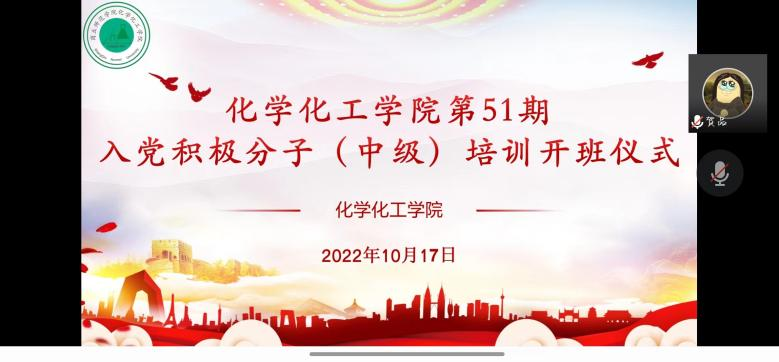 百年青春心向党,矢志建功新时代,在党的二十大召开之际,为做好入党积极分子的教育培训工作,引领学院青年更好地走向未来,把好党员发展的第一关。10月17日中午,化学化工学院在线上举行第51期入党积极分子(中级)培训班开班仪式。参加本次开班仪式的有化学化工学院党委副书记、院长张银堂,党委副书记张颜梅,团委副书记郭家瑞,以及学生第一党支部书记李龙梅,学生第三党支部书记郭冠群和68名中级入党积极分子。本次培训班开班仪式主要有三项议程。