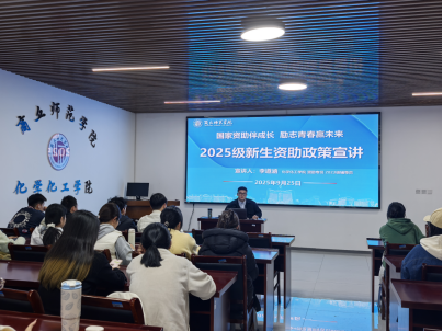 为扎实落实立德树人根本任务,深化资助育人内涵,推动精准资助工作提质增效,9月25日,化学化工学院2025级新生入学教育系列资助政策宣讲活动在工科实训楼309会议室举行。学院资助专员李道涵主讲,全体新生同步参与。