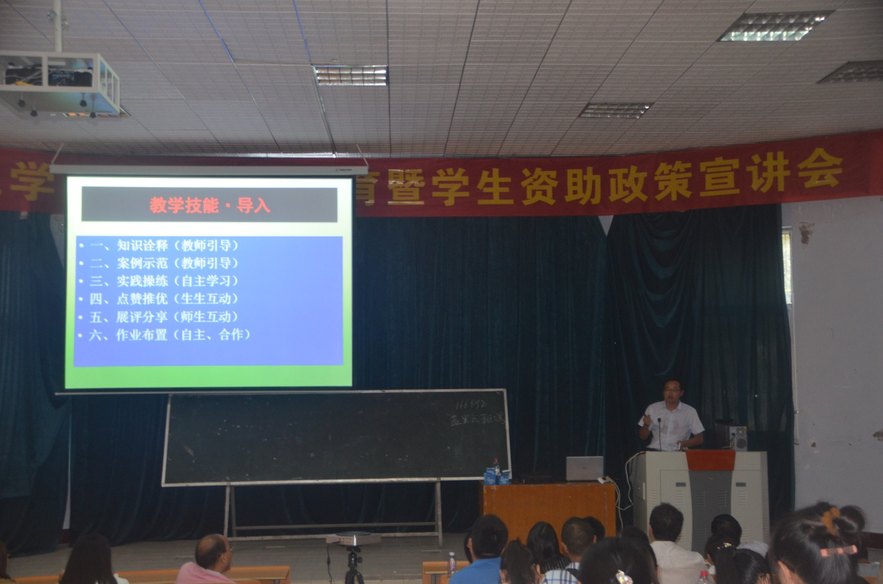 为大力推进课程教学范式改革,推动学院转型发展,9月23日下午,化学化工学院在文化路校区物理与电气信息学院报告厅举行了教学范式改革观摩课,特邀请物理与电气信息学院赵世华博士与文学院王立副教授开展教学范式改革观摩课活动。化学化工学院党总支书记邱友良、副院长瞿鹏、翟滨、刘瑛出席会议,刘澜涛博士等50余位专业老师及2013级参加教育实习的学生聆听了此次教学观摩课,会议由化学化工学院副院长瞿鹏主持。