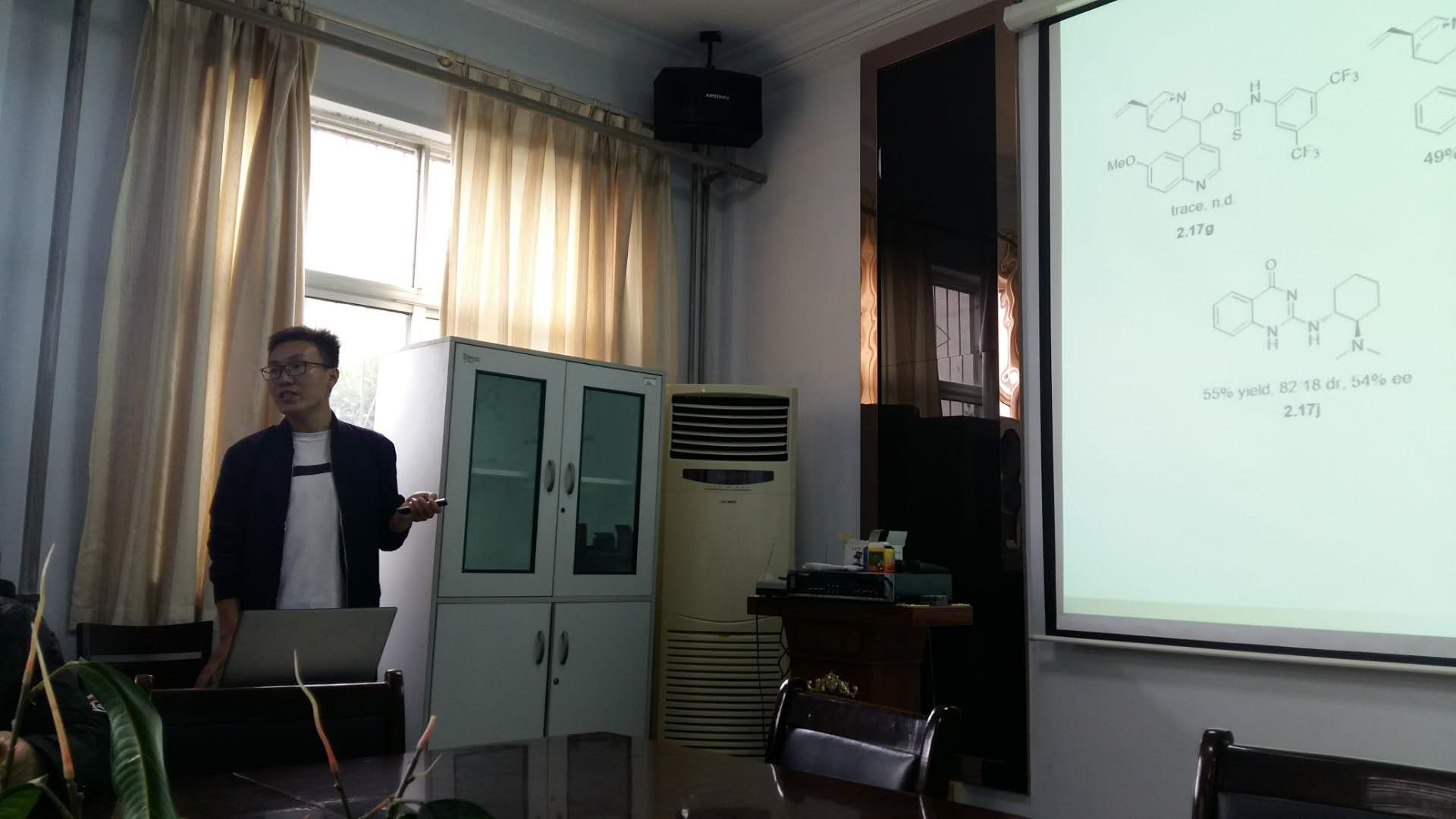 张明亮博士向大家汇报了攻读博士学位期间在小分子催化不对称合成领域所做的工作。首先利用芳乙酰基磷酸酯结构中磷酸酯基团较强的吸电子能力和离去能力,使其作为芳乙酸等价体与硝基烯烃发生不对称Michael加成反应、与β,γ-不饱和-α-羰基羧酸酯发生Michael/cyclization串联反应,高选择性的构建了一系列在生物活性分子或天然药物中广泛存在的α-手性羧酸酯、3,4-二氢吡喃-2-酮及5,6-二氢吡喃-2-酮类骨架。其次利用双功能多氢键催化剂,实现了不饱和吡咯2,3-二酮的 Henry反应,以中等收率和选择性得到了一系列3-羟基-3-硝甲基不饱和吡咯烷酮类化合物。相关研究成果分别发表在Organic LettersTetrahedronBeilstein Journal of Organic Chemistry等国际期刊上。