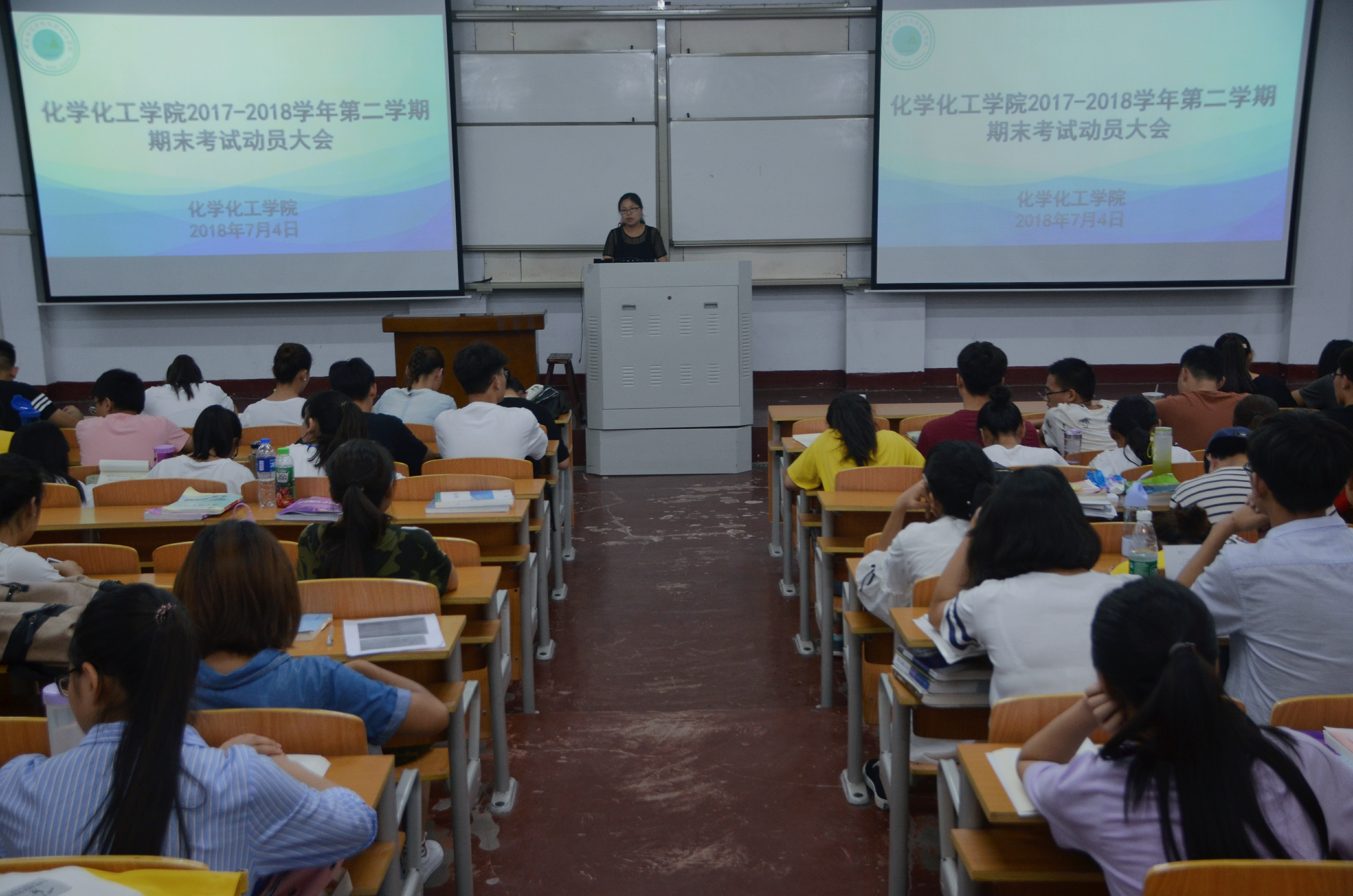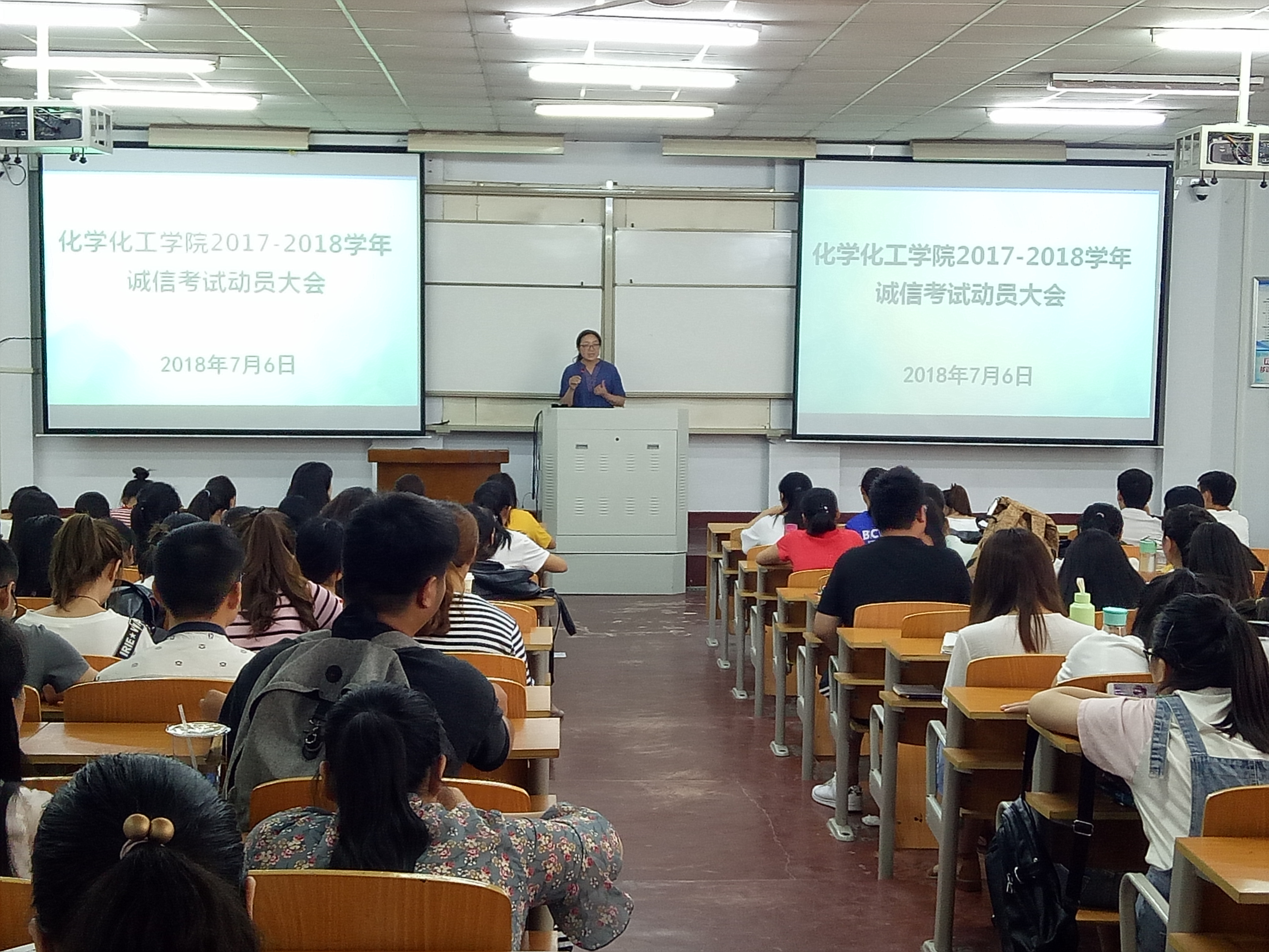期末考试之际,为弘扬我校优良学风,培养刻苦学习、诚实守信的作风,树立化学化工学院学子自尊自律的良好形象。化学化工学院于7月3日—6日分别召开了2017-2018学年诚信考试动员大会,各年级辅导员、班主任老师分别针对各年级、各班学生主持召开了期末诚信考试动员大会。
