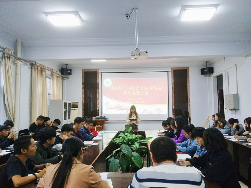 10月14日下午,化学化工学院于文化路校区7号楼会议室举行团总支•学生会换届竞选暨学习《学生会、研究生会干部自律公约》会议,大会由院团总支副书记王宇杰主持,团总支书记李龙梅及18级辅导员邵一方出席,团总支•学生会全体成员到场参加。