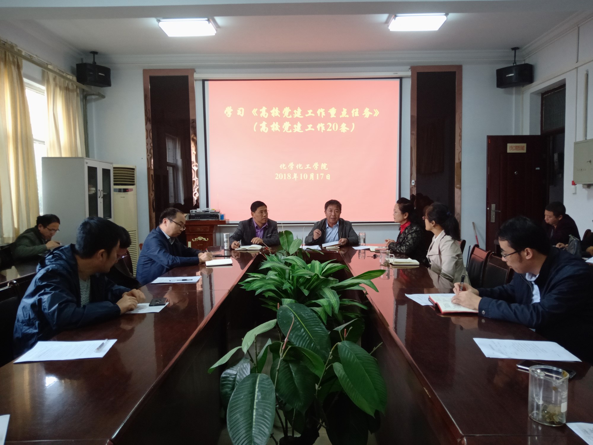 10月19日,化学化工学院于睢阳校区7号楼会议室召开全体党员大会,学习《高校党建工作重点任务》(党建工作20条)。院党总支书记韩忠民、院长瞿鹏、党总支副书记刘瑛以及副院长孟团结、周艳丽出席会议,韩忠民书记主持会议。