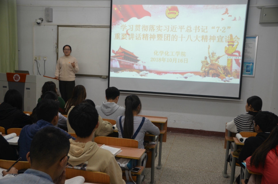 10月16日晚,化学化工学院于文化路校区1#409、410教室召开学习贯彻落实习近平总书记关于“7•2”重要讲话精神暨团十八大精神宣讲会,化学17-1及化工17-1团支部全体团员参加了宣讲会,院团总支书记李龙梅主讲。