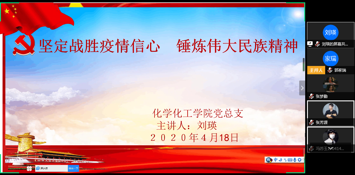 本次培训以线上集中培训为主,结合线下自学,通过线上专题党课培训、线上小组讨论、线下观红影、自学等方式进一步提高入党积极分子的政治理论素养,增强政治觉悟。在培训开班仪式上,党总支副书记刘瑛宣读了《化学化工学院第46期入党积极分子培训计划》,强调培训内容以党的基本理论、路线、纲领等内容为重点,并紧密结合当前疫情防控形势进行。之后分别邀请学院党总支书记韩忠民、院长瞿鹏、党总支副书记刘瑛、学生第三党支部书记邵一方、学生第四党支部书记郭家瑞进入第46期党课“云课堂”为积极分子讲授专题党课,讲授内容既有对党章、对中国梦的解读,又有结合目前疫情防控形势对积极分子进行的爱国主义教育,既引导入党积极分子如何端正入党动机,又使积极分子清晰明确党员发展的方针和程序。线上专题党课讲授内容丰富,贴合培训实际,真正达到了培训的目的。