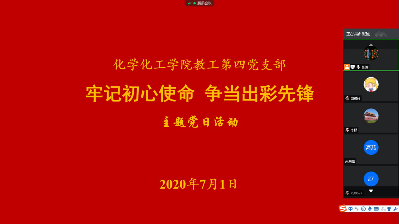 为庆祝中国共产党成立99周年,深化“不忘初心、牢记使命”主题教育成果,化学化工学院教工第四党支部于2020年7月1日在线开展了“牢记初心使命、争当出彩先锋”主题党日活动。
