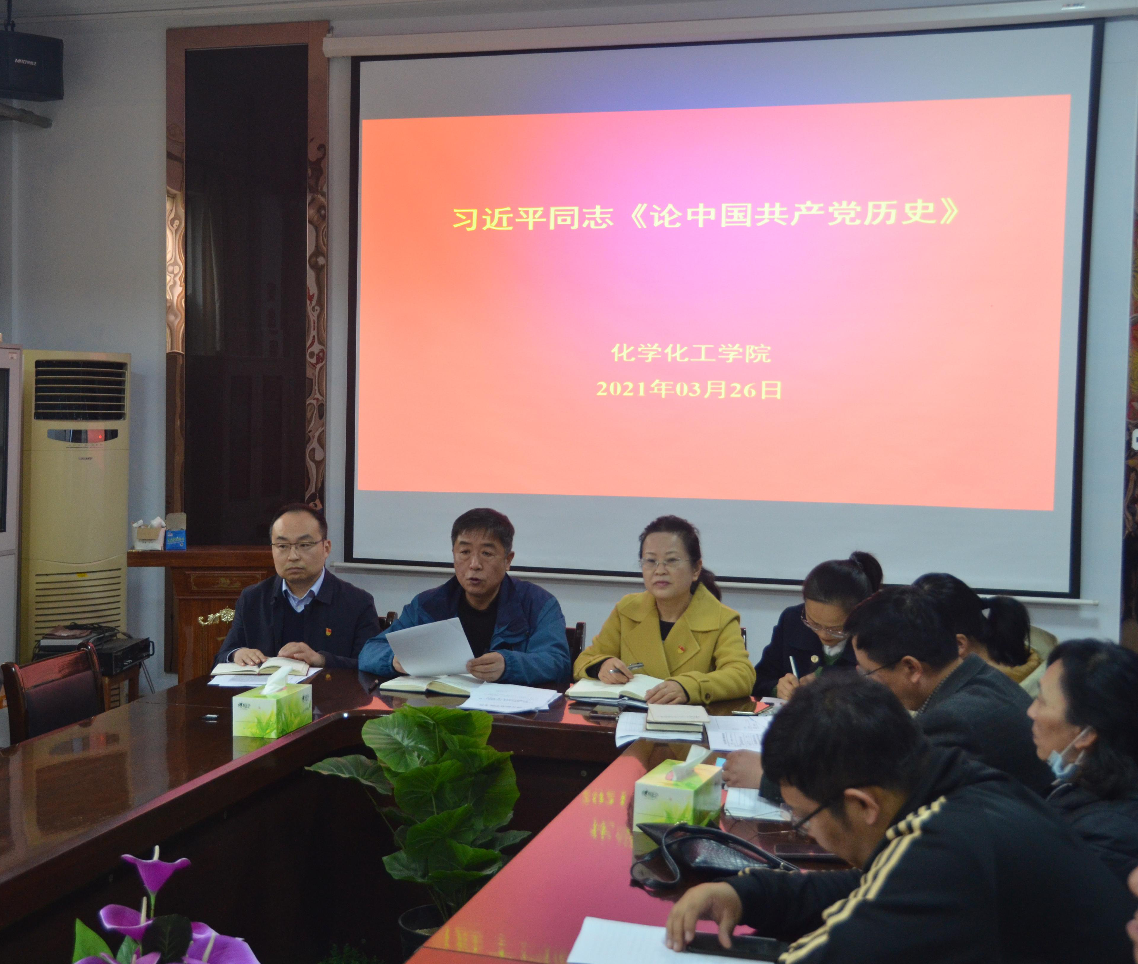 3月26日,化学化工学院于睢阳校区7号楼会议室组织“习近平同志《论中国共产党历史》”专题学习研讨会,本次会议由党总支书记韩忠民主持,全体教职工参加。