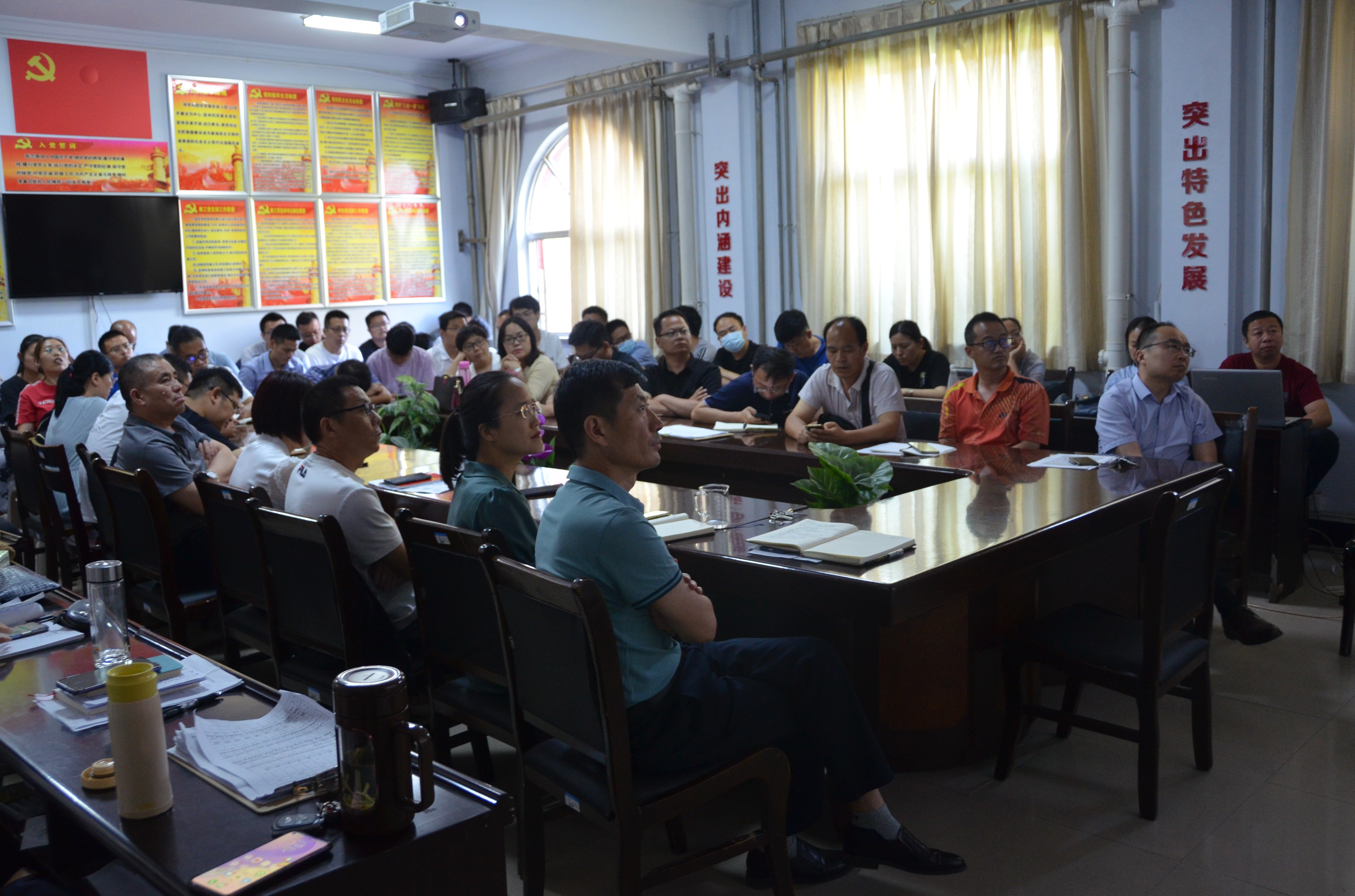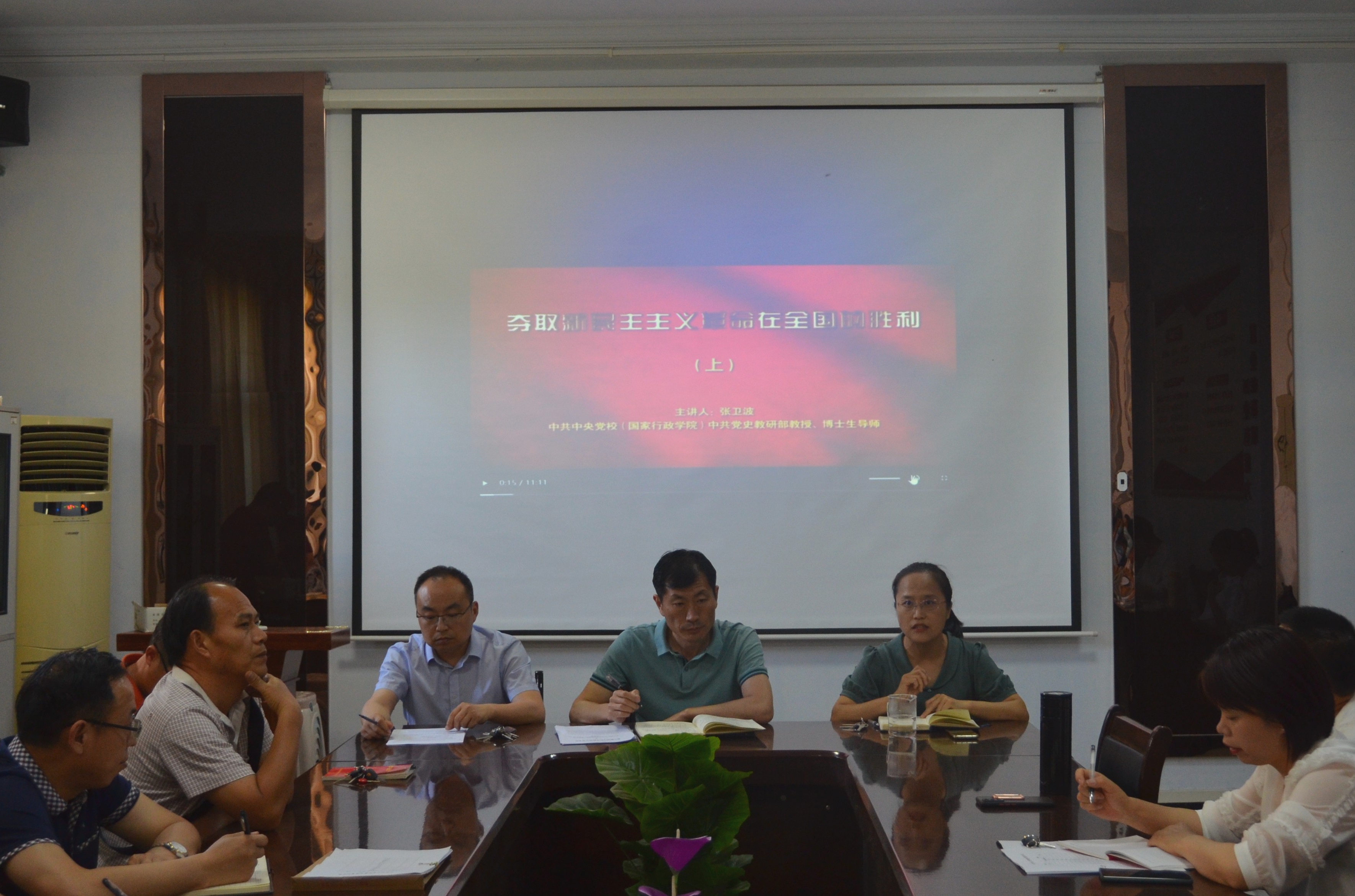 会上李海涛组织全体教职工集中收看了张卫波老师所做的《夺取新民主主义革命在全国的胜利》专题辅导报告视频,带领我们重温了中国共产党取得新民主主义革命胜利的光辉历史。多年的战争使中国人民生活在水深火热之中,中国共产党始终把人民群众的利益作为根本出发点,得到了人民的支持与爱戴,面对国民党的打压,中国共产党带领中国人民奋起自救,多次打破国民党的围剿,最终取得关键性胜利。李海涛指出,我们要认识到红色政权来之不易,一定要珍惜现有的生活,牢记我党的初心和使命,做好我们当代人的红色传承。