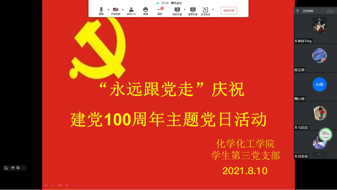 8月10日,化学化工学院学生第三党支部通过腾讯会议组织开展“永远跟党走”庆祝建党100周年主题党日活动,党支部书记史展首先带领全体党员深入学习了习近平总书记的重要讲话精神,引领广大同志听党话跟党走,做伟大事业的建设者、文明风尚的倡导者、敢于追梦的奋斗者,以实际行动向党的百年华诞献礼,为全面建设社会主义现代化国家贡献青春力量。其次,史展强调要在疫情仍在全球蔓延时期认真做好疫情排查工作,做到数据准确,及时做好防疫工作,做好自我保护。最后,支部全体党员表示,要始终坚持人民至上,立志为党分忧、为国尽责、为民造福,以实际行动诠释对党的忠诚之心、对人民的赤子之心。尤其是在这个疫情险峻的时刻,要全力以赴做好防控工作,树立高度的责任意识,打赢疫情防控狙击战。