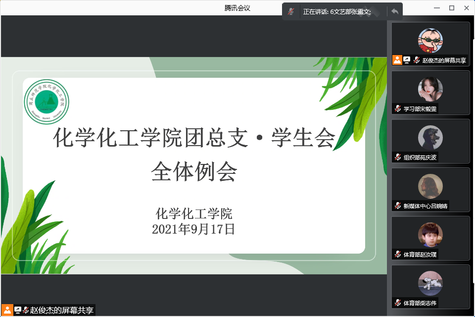 为增强化学化工学院团总支·学生会成员工作能力和服务意识,保证新学期各项工作扎实推进,9月17日下午,团总支•学生会于腾讯会议召开线上全体例会,会议由赵俊杰主持。