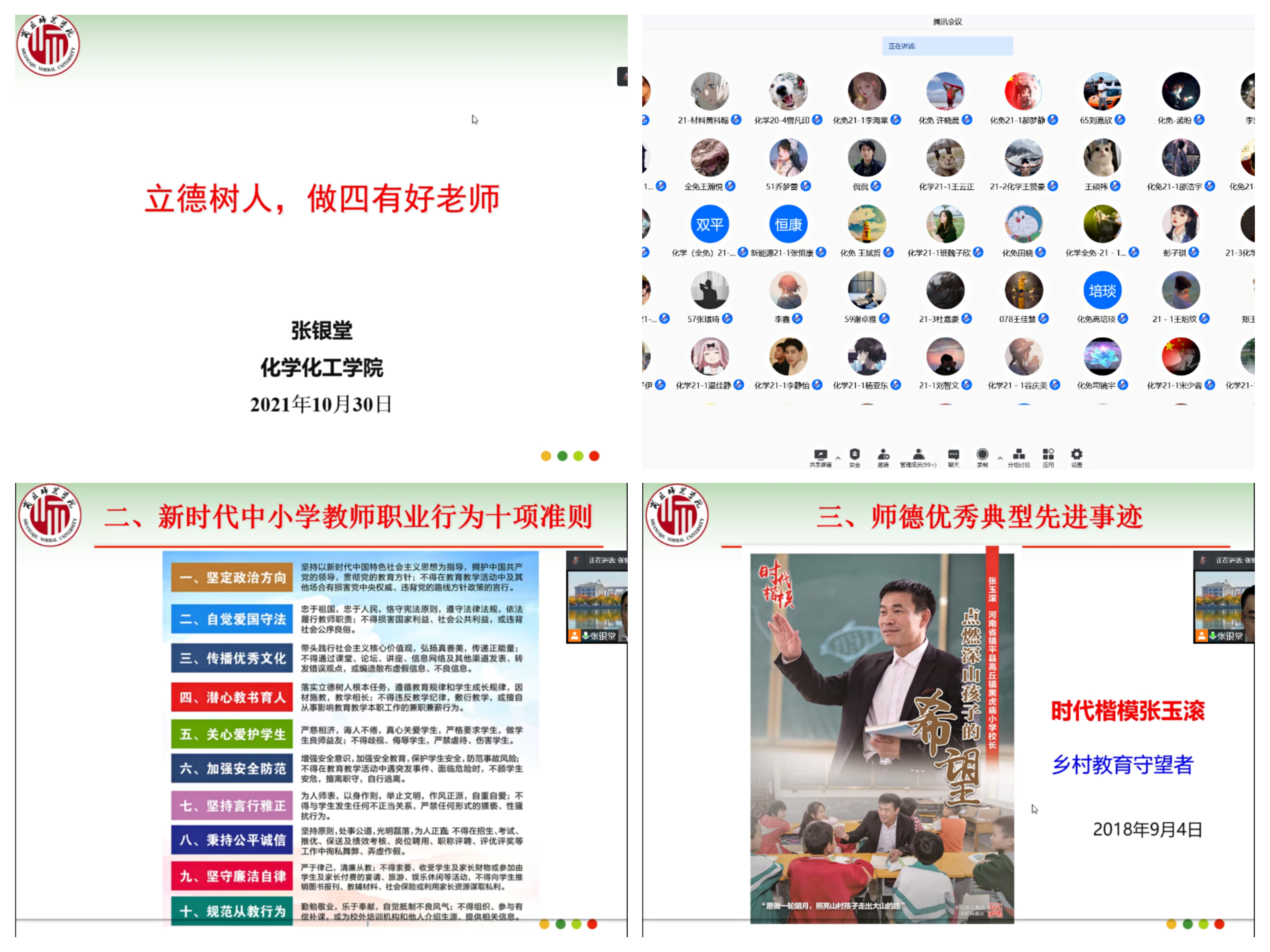 为全面推进师范专业学生师德师风主题教育,10月30日,化学化工学院张银堂院长为21级化学(师范)专业新生做了“立德树人,做四有好老师”为主题的师德师风讲座。