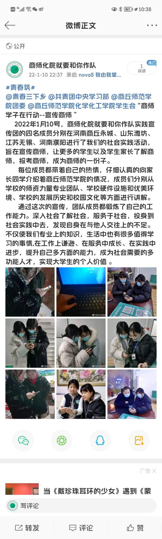 活动开展第七天,团队成员积极加入疫情防控志愿服务工作。与此同时,团队成员利用空闲时间积极向家人介绍商师、宣传商师。成员在向大家宣传学校的同时,也更加深刻的理解了“应天归德,智圆行方”的内涵。队员通过图片、视频、广告海报宣传等方式,让大家更全面的了解学校的师资力量、硬件设施、优美环境、发展历史和校园文化等。