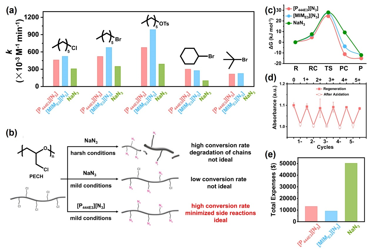 利用叠氮离子液体对模型小分子进行叠氮化,研究表明相比于传统的叠氮化钠,叠氮离子液体具有更高的反应速率常数和对多种功能基团的耐受性。作者在对多种聚合物前驱体的叠氮化的实验中,叠氮离子液体均可以在十分温和的条件下实现几乎定量的叠氮化率,且多数情况下无需加入其它有机溶剂。基于该方法,首次实现了数均分子量达10万以上的超高分子量聚叠氮缩水甘油醚(GAP)的合成。理论计算表明,叠氮离子液体具有比叠氮化钠更低的解离能,同时三甘醇的引入起到了“路易斯碱”的作用,其与阳离子中心的相互作用,加速了叠氮根在在叠氮化反应中的游离释放。叠氮离子液体在完成叠氮化反应后,还可以通过离子交换进行再生,这将进一步降低其使用成本。以叠氮化1千克聚环氧氯丙烷为例,在5次循环再生后,使用叠氮化钠进行叠氮化的费用是叠氮离子液体的5.5倍。这一研究结果为叠氮聚合物的合成提供了一条更加安全、绿色、高效的路线。