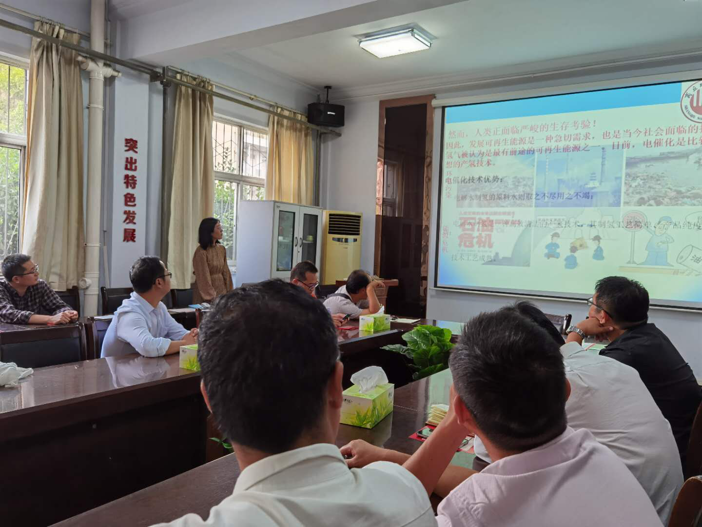 陈稳霞博士向大家汇报了攻读博士期间关于MOFs材料及其衍生物在电催化方面所做的相关工作以及下一步工作计划。首先介绍了课题研究背景及研究现状、电催化研究过程中遇到的瓶颈问题,通过设计高效电催化挤来解决一些关键科学问题等;然后具体讲解了博士期间在导师指导下开展的研究工作,包括:介孔钴-铁-有机骨架:等离子体增强的析氧电催化剂;Ni-Co氢氧化物纳米片在等离子体还原的ZIF-67纳米笼上用于电催化水氧化;镍掺杂和二甲基咪唑诱导的层状双氢氧化物复合材料用于全水解。相关研究成果发表在Journal of Materials Chemistry A和Journal of Power Sources等国际期刊上。报告会后,各位老师与陈稳霞博士就相关科学问题进行了深入探讨。