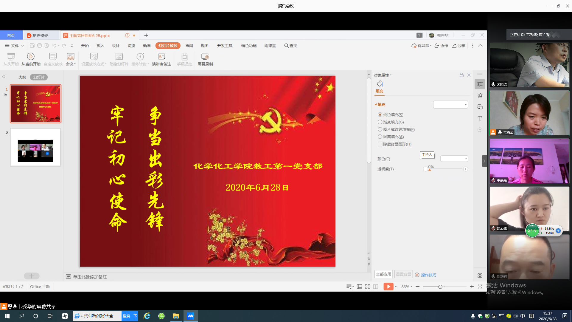 为庆祝中国共产党成立99周年,传承中国共产党的优良品质,回顾中国共产党的艰苦的创建过程,6月28日下午,化学化工学院教工第一党支部开展了“七一”主题党日活动——观看《建党伟业》经典影片。