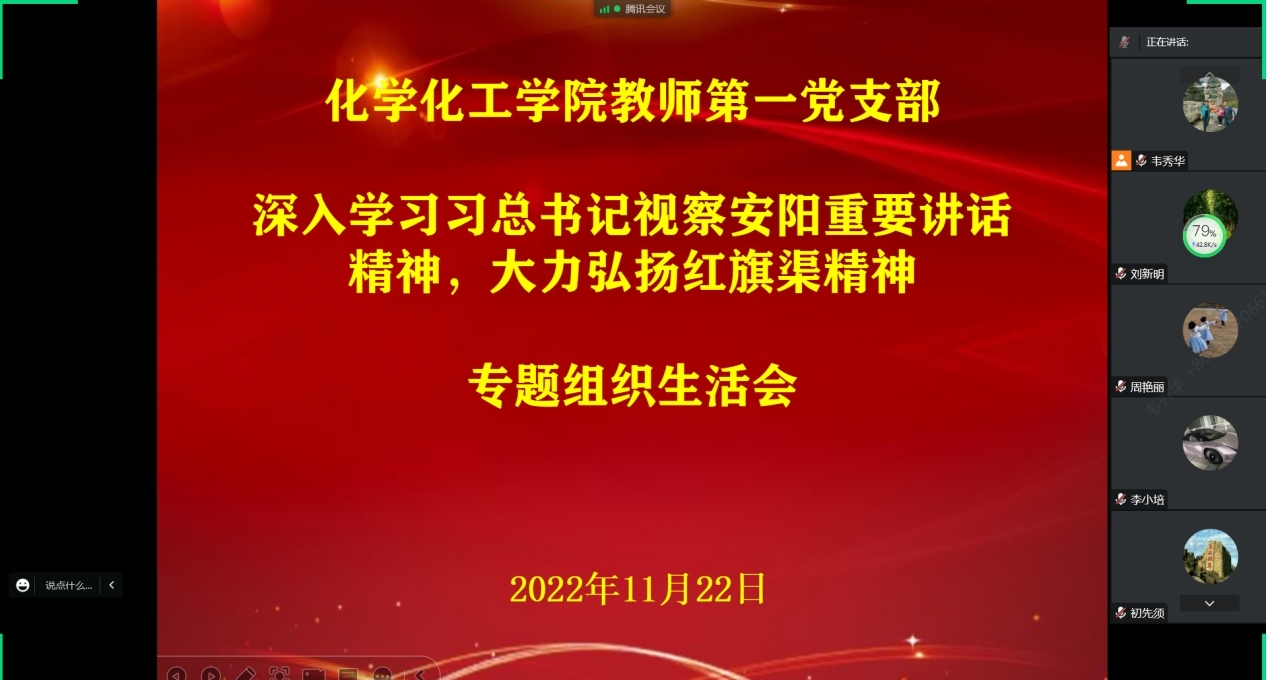 为深入学习贯彻党的二十大精神和习近平总书记视察安阳重要讲话精神,加快推进化学专业建设。1122日下午,化学化工学院教师第一党支部通过腾讯会议召开以“深入学习习近平总书记视察安阳重要讲话精神,大力弘扬红旗渠精神”为主题的专题组织生活会,支部书记韦秀华主持会议,支部全体党员参加学习。