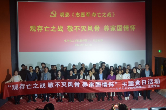 为深入学习党的历史,弘扬爱国主义精神,11月1日,化学化工学院教师第二支部、第三党支部联合举行了“观存亡之战 敬不灭风骨 养家国情怀”主题党日活动。本次活动通过组织观看电影《志愿军:存亡之战》,进一步激发大家的爱国情怀和责任感。化学化工学院领导班子、两个支部全体党员、部分学生党员参加了本次党日活动。