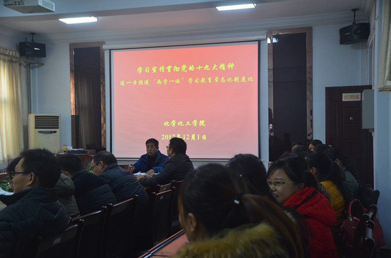 12月1日下午,化学化工学院于我校文化路校区7号楼院会议室召开了“学习贯彻党的十九大精神——进一步推进‘两学一做’学习教育常态化制度化”的学习交流会议。化学化工学院全体教师参加了会议。会议由院党总支书记韩忠民主持。