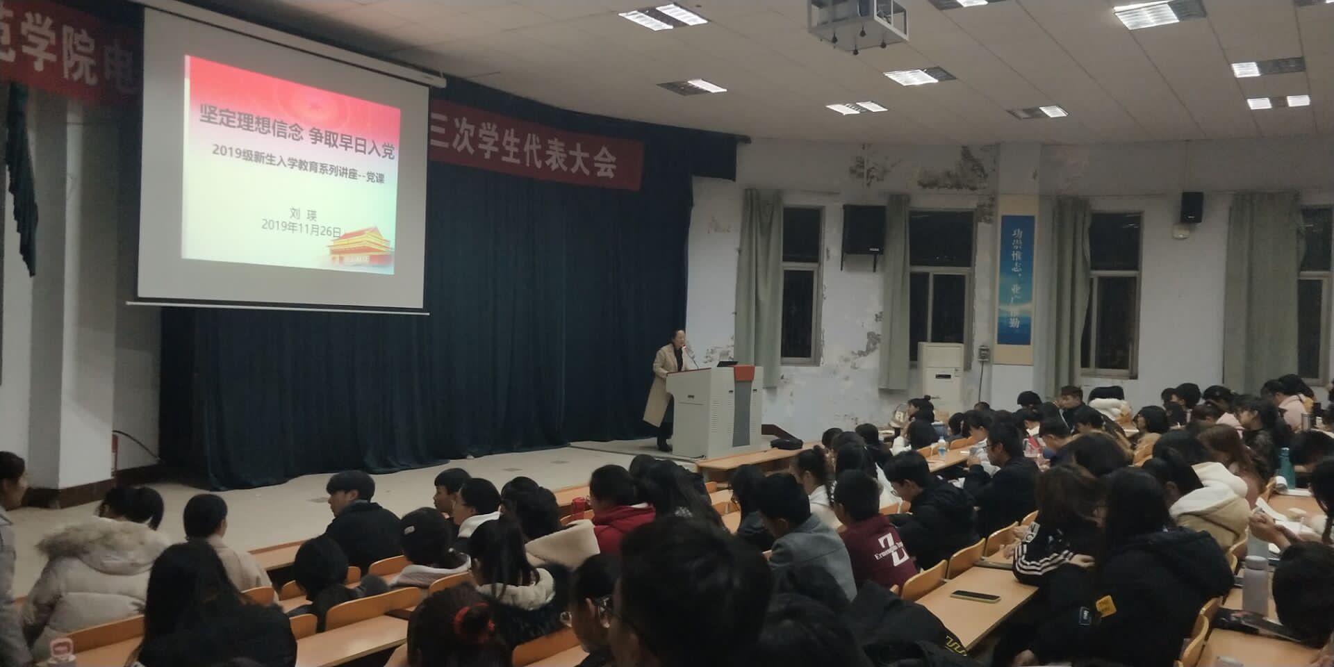 为深入贯彻党的十九大精神,加大对党组织的认识,引导新生积极向党组织靠拢,11月26日晚上,化学化工学院于睢阳校区物电报告厅举行了“坚定理想信念,争取早日入党”的主题讲座,化学化工学院19级全体新生参加,党总支副书记刘瑛主讲。