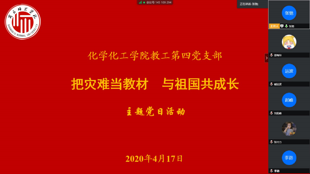 为深入贯彻落实习近平总书记重要指示精神,进一步增强对教师党员的教育引导,提升党员报国力行的使命责任感,引导支部全体党员把灾难当教材、把困难当磨砺,做到在灾难面前与国家共患难、与人民共进步,4月17日下午,化学化工学院教工第四党支部通过视频会议的形式开展“把灾难当教材,与祖国共成长”主题党日活动。
