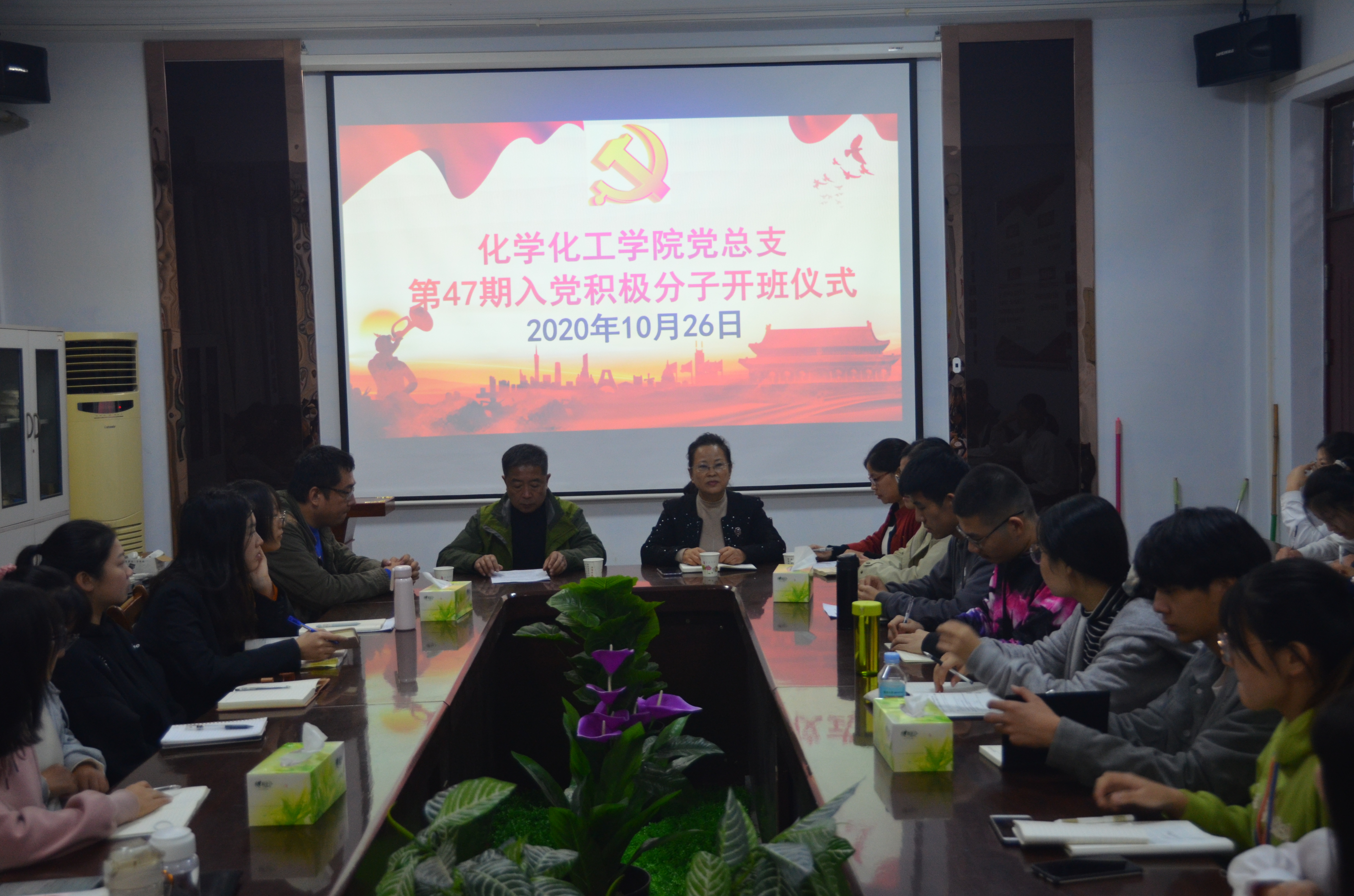 为学习贯彻习近平新时代中国特色社会主义思想,不断提高入党积极分子的思想政治素质和政治理论水平,进一步提高入党积极分子对党的认识,明确入党目的,端正入党动机,坚定理想信念。2020年10月26日晚,化学化工学院于睢阳校区7号楼会议室举行了第47期入党积极分子培训班(中级)举行开班仪式。化学化工学院党总支书记韩忠民,党总支副书记刘瑛,团总支副书记郭家瑞,学生第二党支部书记于丽敏,学生第三党支部书记邵一方出席,郭家瑞主持,全体入党积极分子参加。