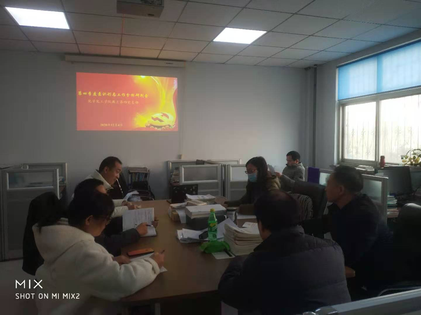 2020年12月4日下午,化学化工学院教工第四党支部在文化路校区7号楼308室召开专题会议,对支部第四季度意识形态形势进行研判分析。支部全体党员参加了会议(臧运波同志在永城市环保局挂职),会议由支部书记张弛主持。