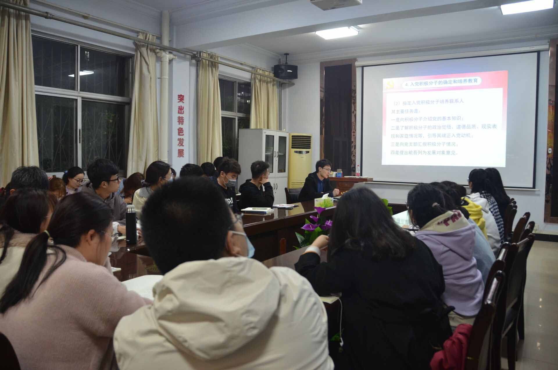 史展从申请入党的条件和党章对党员的基本要求等方面进行了详细阐述,并着重强调要坚持标准,提高发展学生党员质量,坚持把综合素质作为发展学生党员的重要考察内容。随后,从发展党员工作方针、原则和程序方面要求大家牢记“坚持标准、保证质量、改善结构、慎重发展”的十六字方针,并详细介绍了党员发展的程序,使大家对入党的流程有了一个系统的了解。