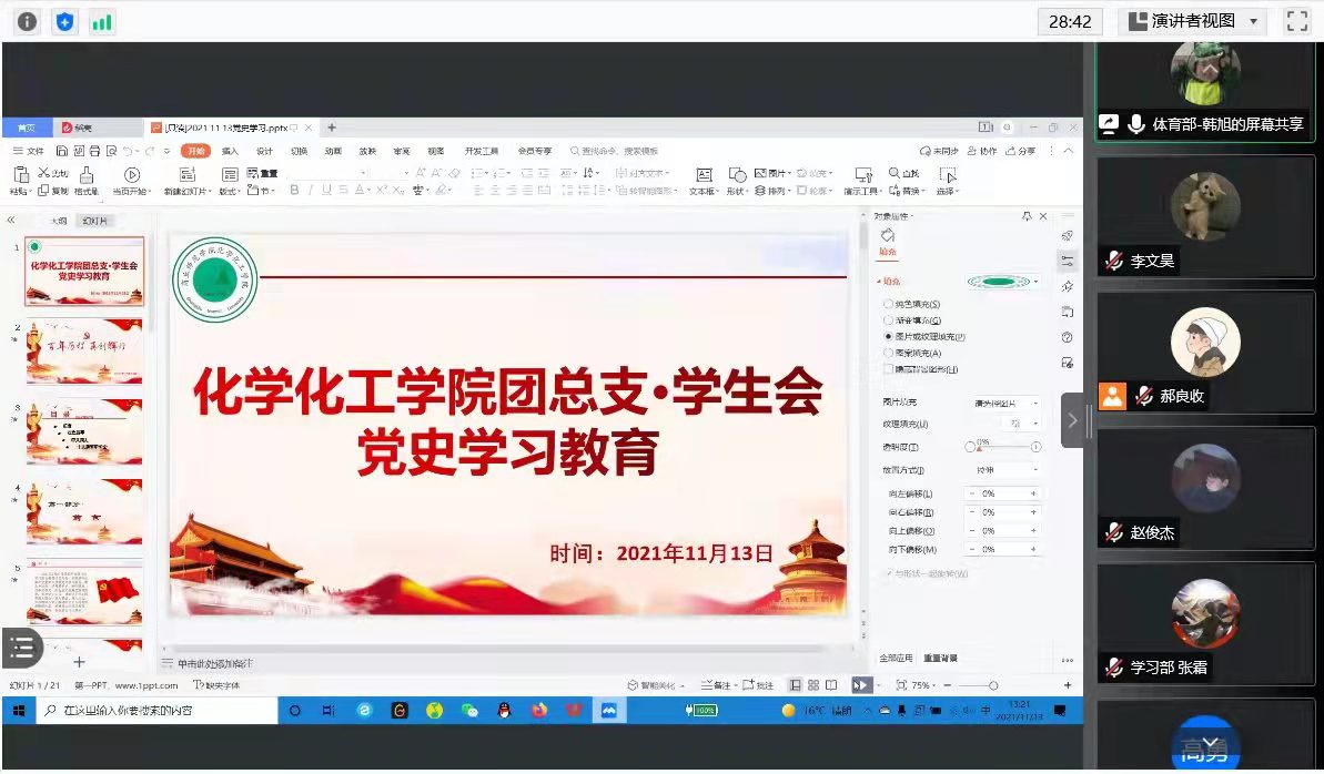 为进一步贯彻落实习近平总书记在党史学习教育大会上的重要讲话精神,提高同学们的思想高度,坚定理想信念。11月13日中午,化学化工学院团总支·学生会于线上组织开展党史学习教育。