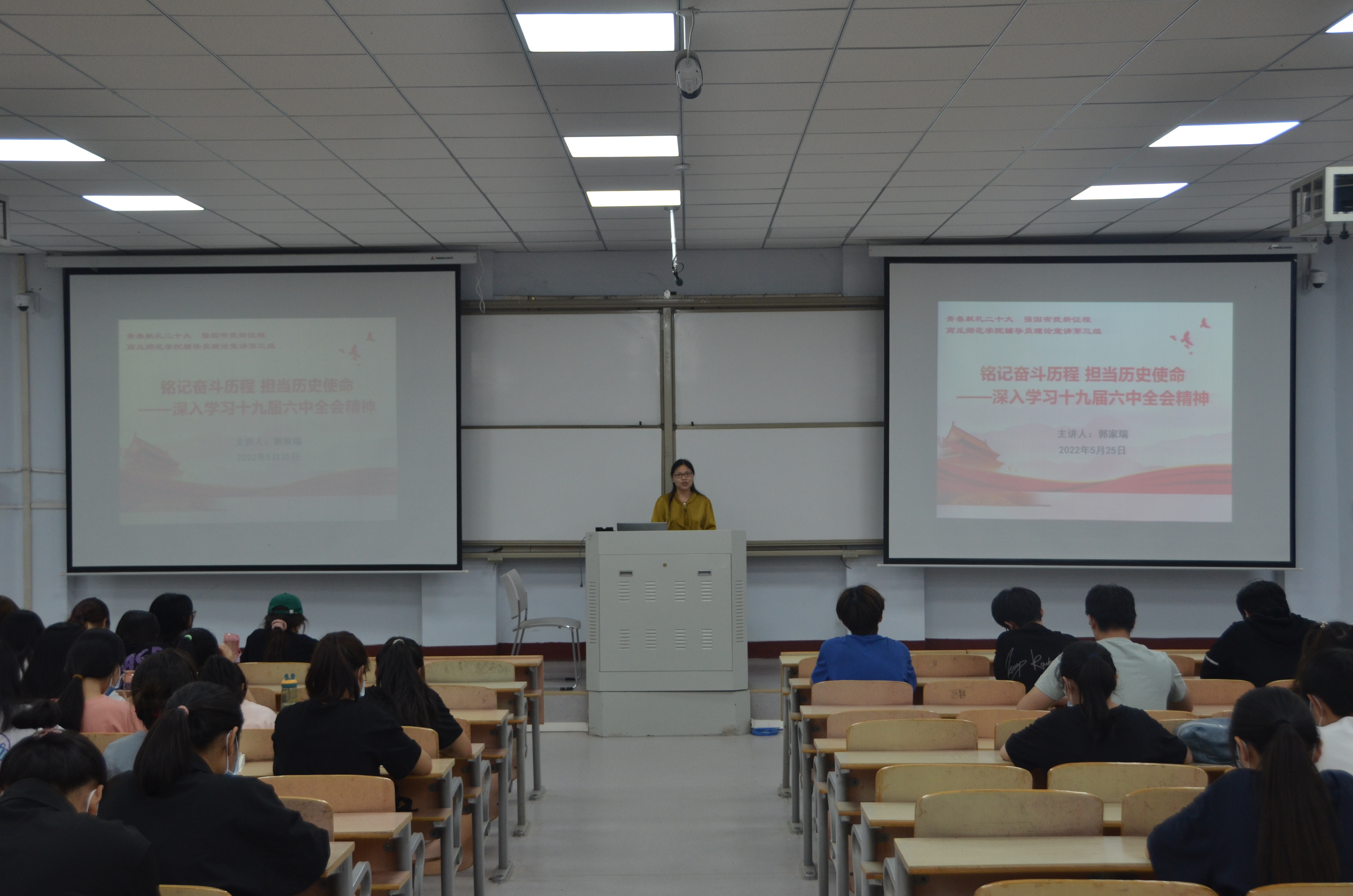 本次宣讲活动以“铭记奋斗历程担当历史使命”为题,紧紧围绕党的十九届六中全会精神进行。郭家瑞通过一组数据:一个根本问题、两个确立、马克思主义中国化的三次飞跃、四个历史时期与四个伟大飞跃、五个方面总结百年奋斗历史意义、十个“明确”、十三个方面新时代历史成就和历史性变革,带领同学们深刻领会“党的十九届六中全会精神”。