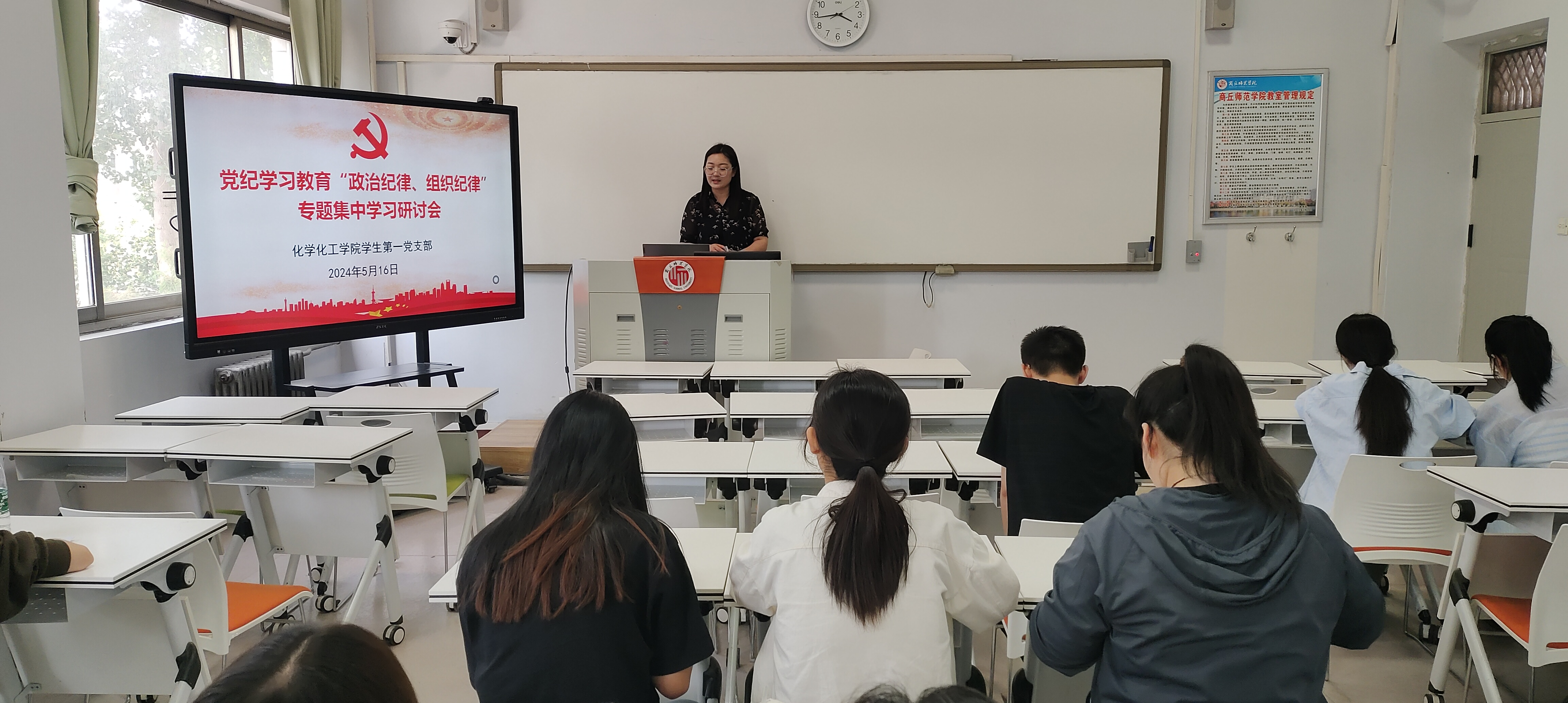 5月16日、5月24日学生第一、第二、第三党支部分别开展党纪学习教育集中学习研讨会和党员警示教育案例分享会,5月29日开展“学《条例》,守党纪”纪律党课。5月17日、5月29日学生第四党支部分别开展“学党纪、明规矩、强党性”专题党课和党纪学习教育专题研讨会,围绕政治纪律、组织纪律进行研讨。