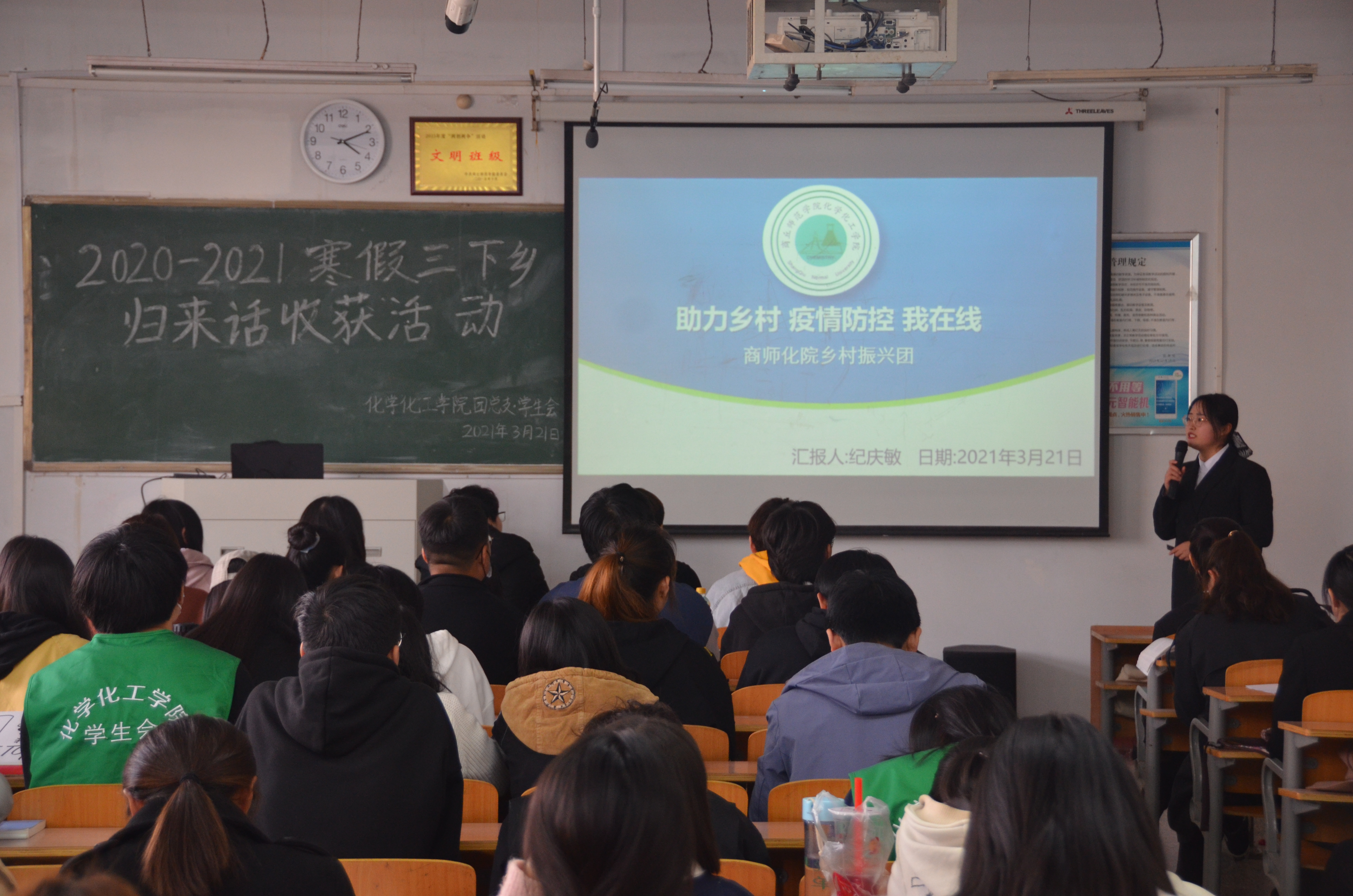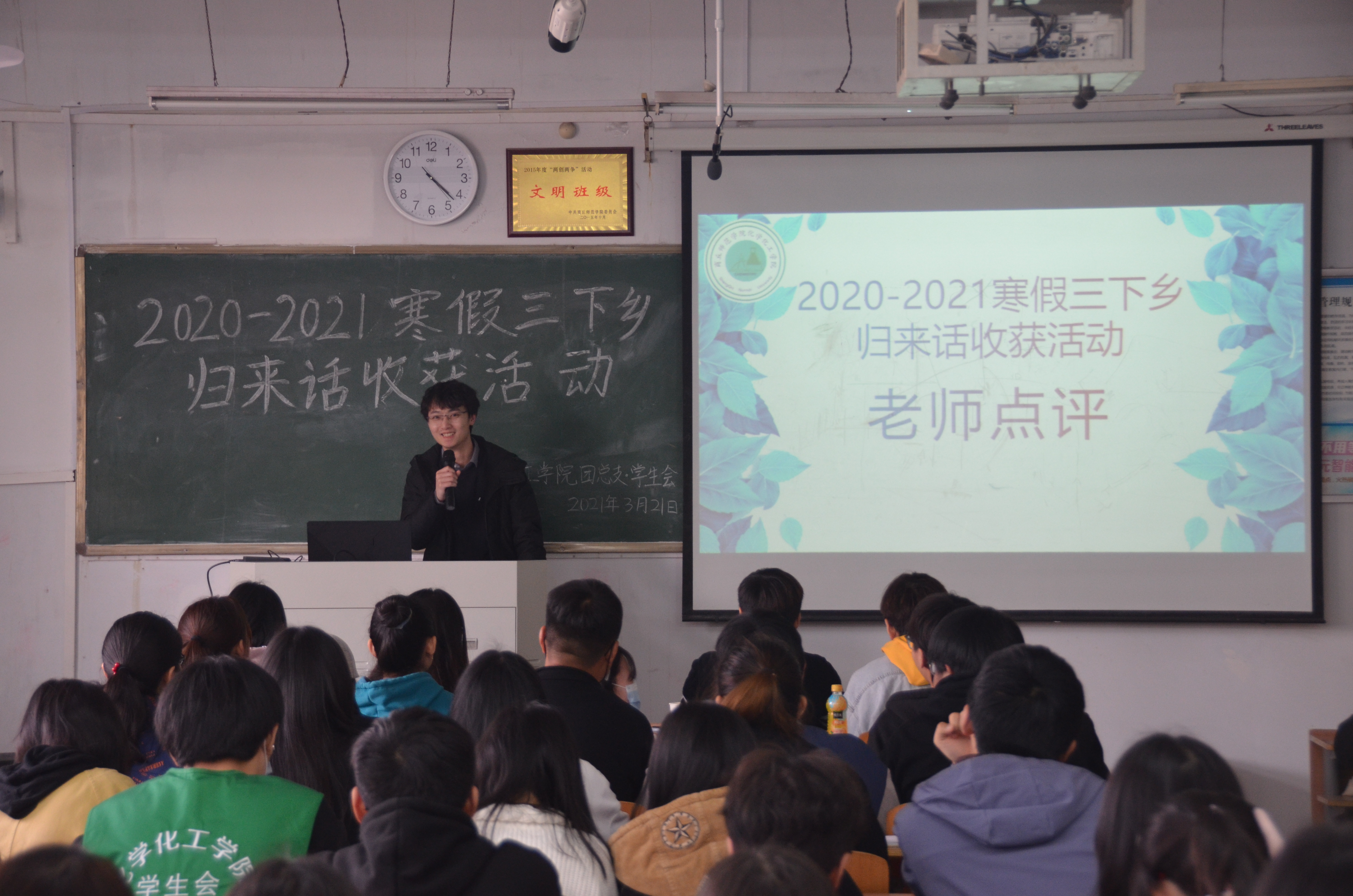 为引导青年学子扎根中国大地了解国情民情,通过社会实践坚定理想信念、站稳人民立场、投身强国伟业。2021年3月21日,化学化工学院于睢阳校区1号楼408室开展以“青春聚力‘十四五’,乘风破浪展风采”为主题的2021年寒假“三下乡“实践归来话收获活动。化学化工学院学生工作办公室副主任史展出席,大一大二学生参加了活动。