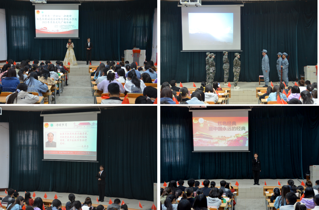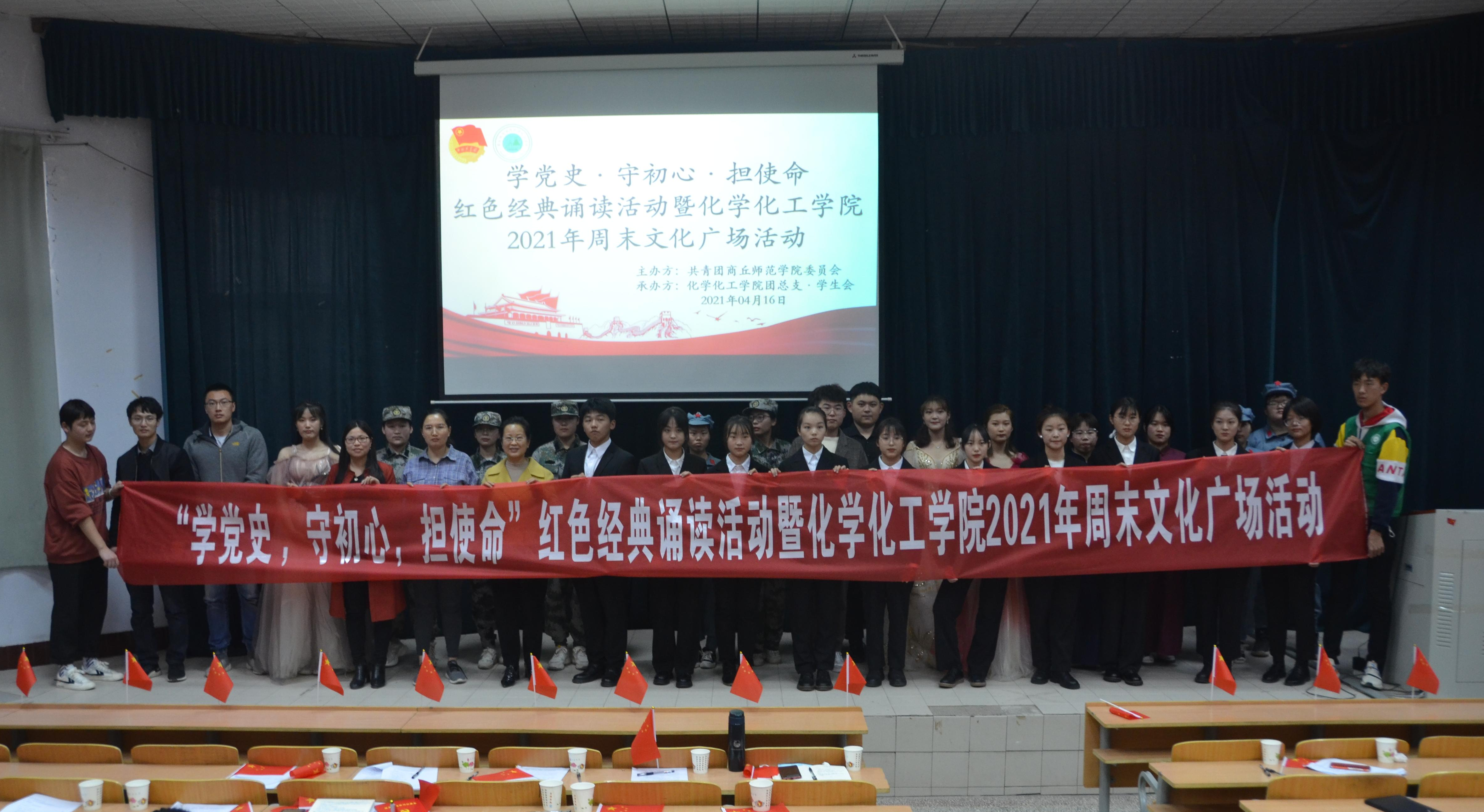 为了引导同学们诵读红色经典,讲好红色故事,传承红色基因,深入推进党史学习教育,4月16日下午,化学化工学院于睢阳校区物电楼报告厅举行了“学党史、守初心、担使命”红色经典诵读活动暨化学化工学院2021年周末文化广场活动。校团委副书记时光,院党总支副书记刘瑛、团总支副书记郭家瑞、学生工作办公室副主任史展参加活动。