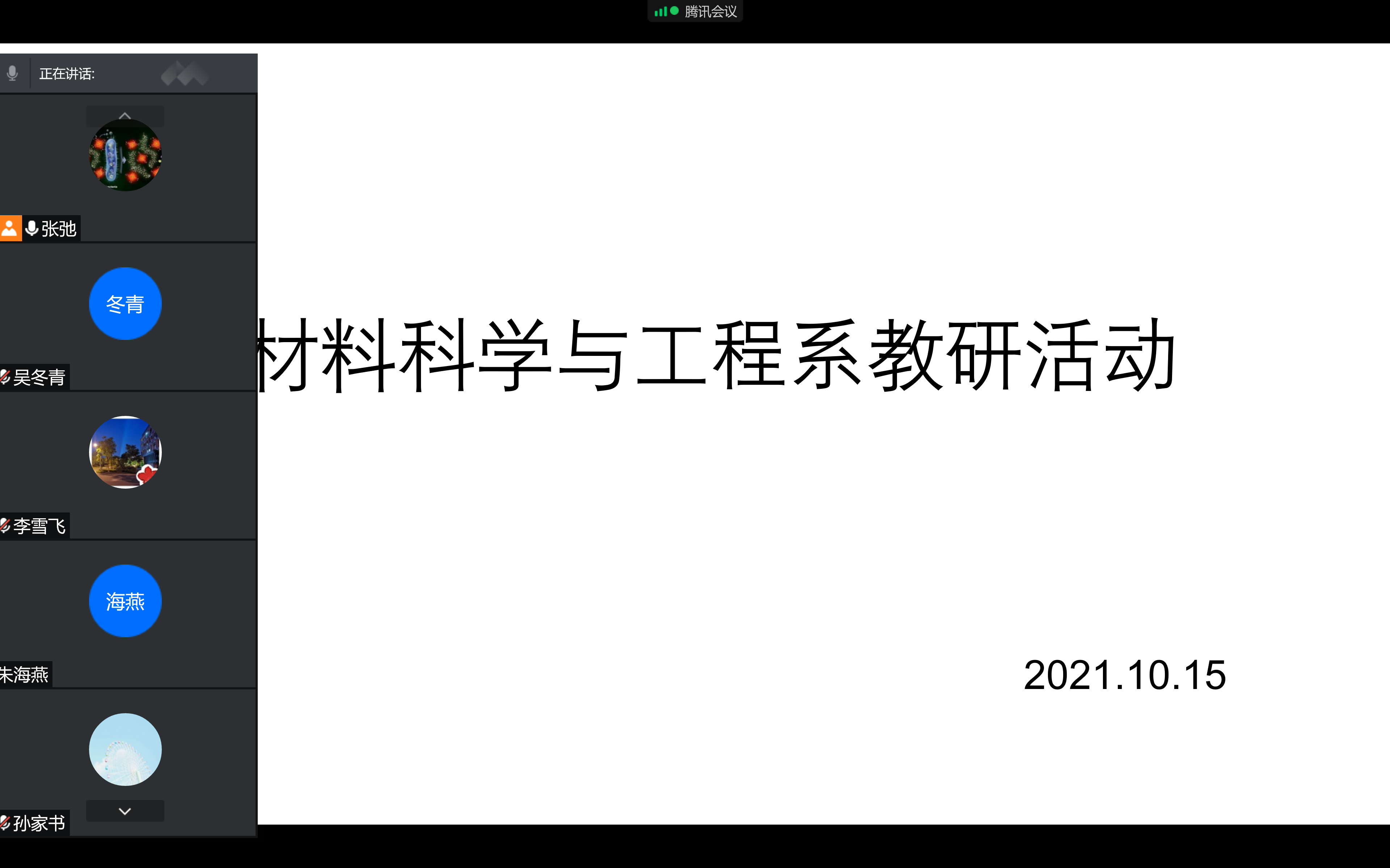 10月15日,化学化工学院材料系利用腾讯会议在线召开了“如何在专业课程中有机融入思政元素”主题教研活动。教研活动由系主任张弛主持,材料系全体老师参加了此次活动。