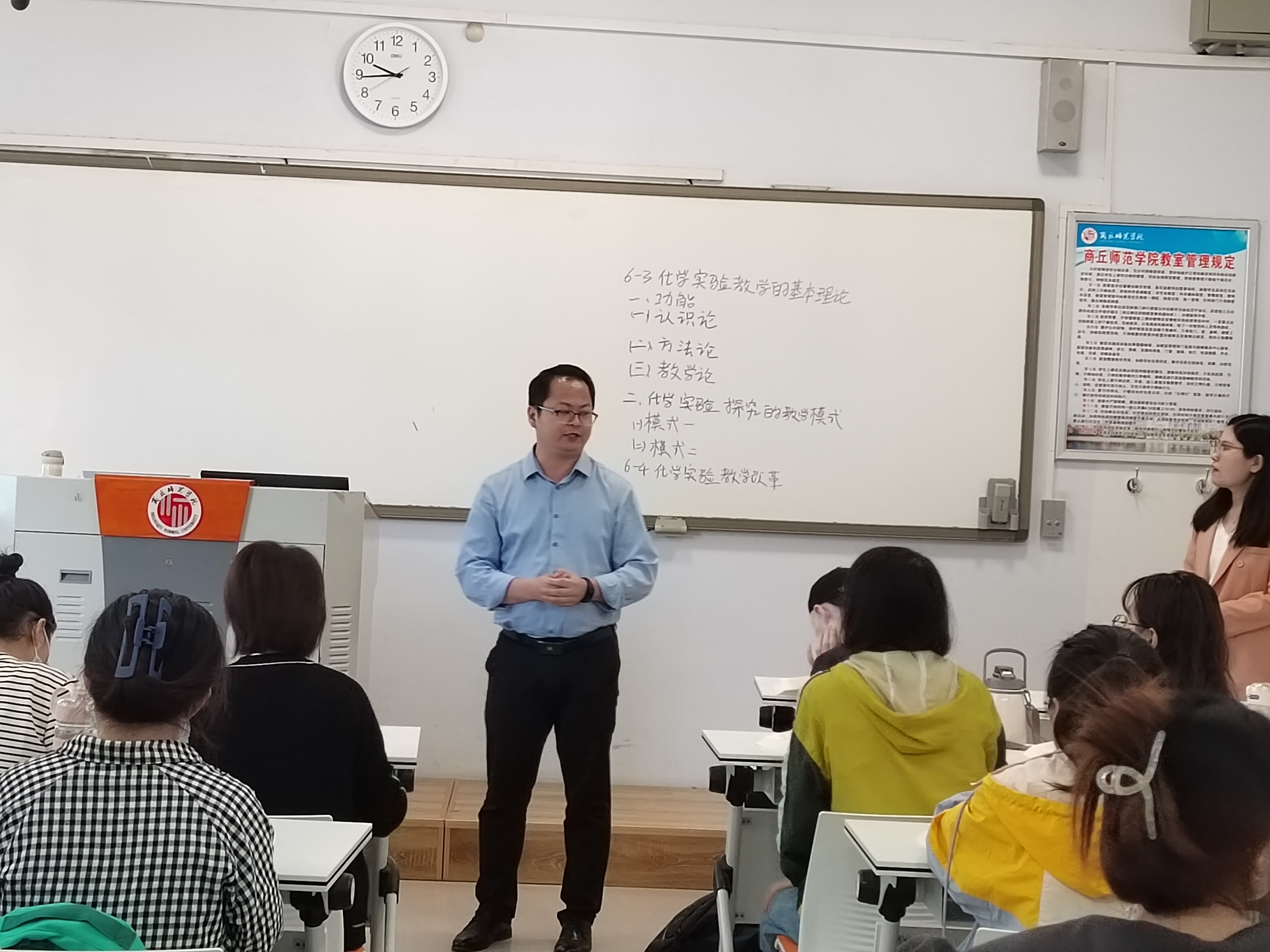 5月22日,化学化工学院青年教师韩文君在1号楼212教室进行了《化学教学论》公开课。副院长王涛,制药工程系主任王晓娟,院督导团成员徐海云、冯翠兰、韦秀华老师莅临现场进行指导。