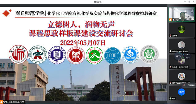 为全面深化课程改革,落实立德树人根本任务,构建“三全育人”体系,化学化工学院有机化学及实验与药物化学课程群虚拟教研室于5月7日举行线上研讨会,会议主题为:立德树人、润物无声,课程思政样板课建设交流会。会议由副院长王涛主持,来自永利23411集团、郑州大学、河北大学、新乡医学院、南阳师范学院、周口师范学院、新乡学院、河南牧业经济学院等八所高校组成的教研室全体老师参会。