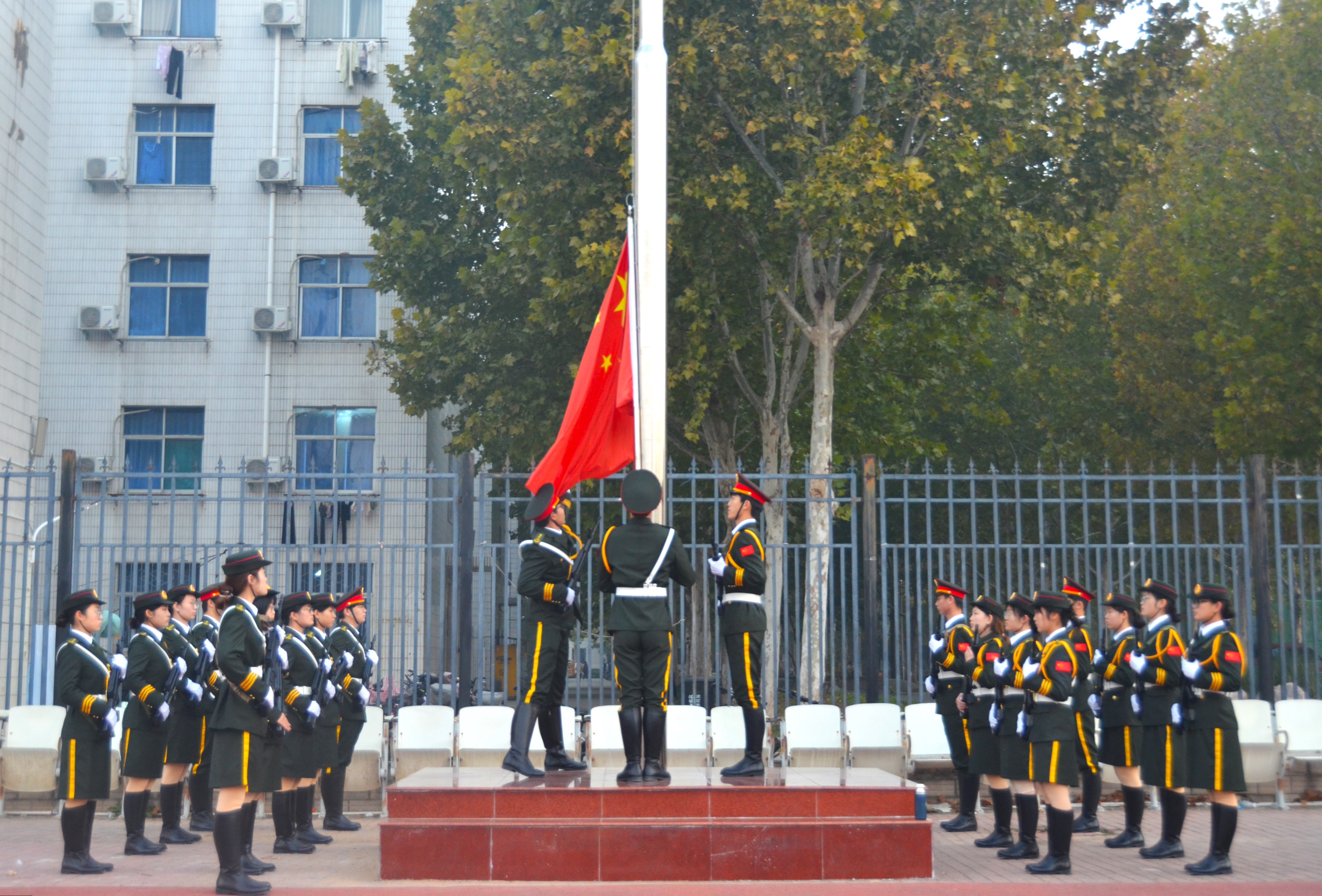 上午6时许,全体参与人员准备就位。7时,升旗仪式正式开始。在全体师生的注目礼下,英姿飒爽的国旗护卫队踏着整齐的步伐护送着鲜艳的国旗走到旗杆下,行礼完毕后,伴随着庄严的《中华人民共和国国歌》,五星红旗冉冉升起,迎风飘扬。在场的每一个人向国旗行注目礼,合唱国歌,表达对五星红旗的崇高敬意和对祖国繁荣昌盛的深切祝福。