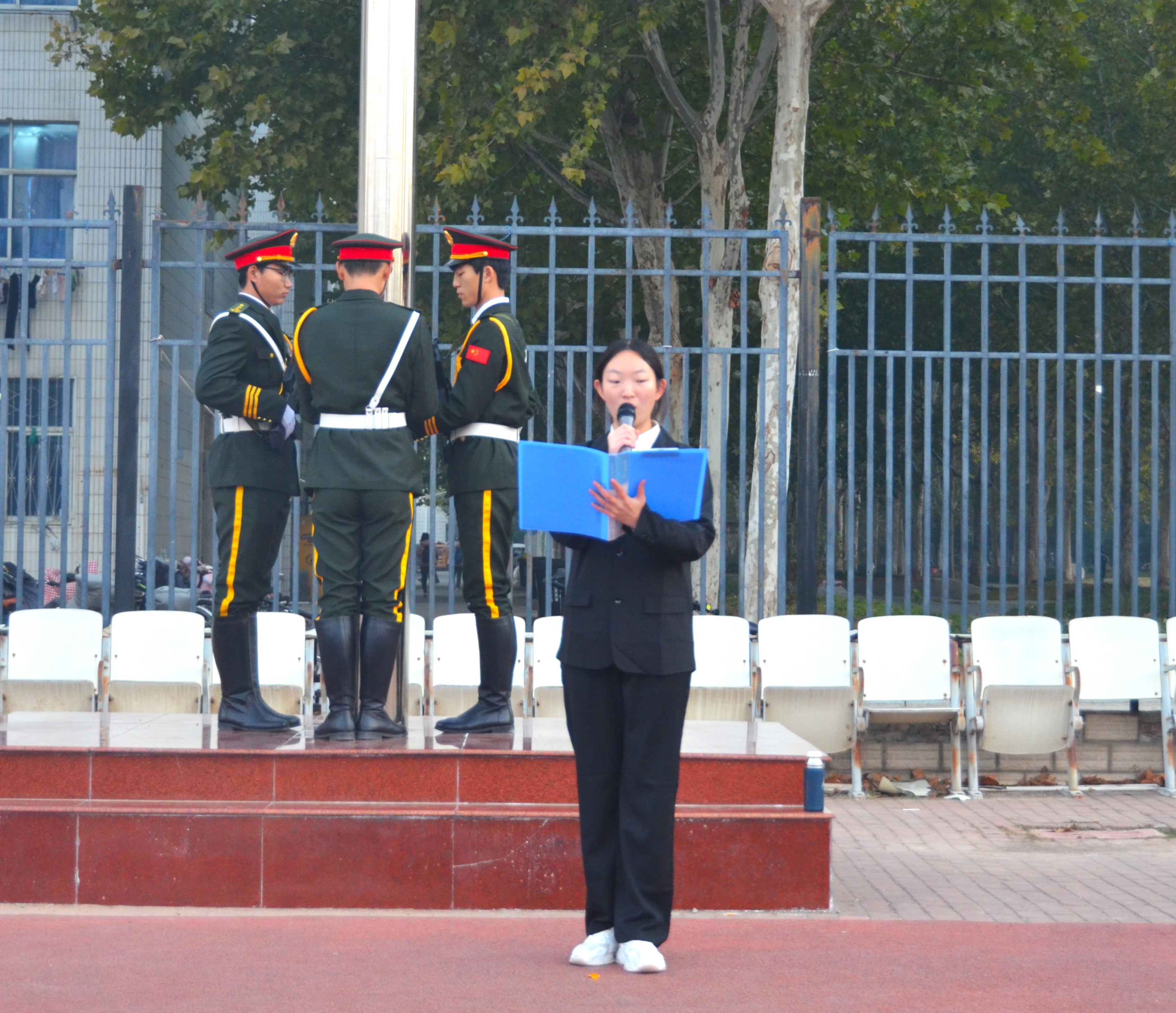 随后,学院2023级学生代表赵佳茜进行国旗下消防安全主题演讲。在演讲过程中,赵佳茜同学用生动的语言和真实的案例,使在场的师生深刻认识到消防安全的重要性。她指出了每个人都有预防火灾的责任和义务,呼吁全体师生共同关注消防安全问题,提高火灾预防和应急处理能力。