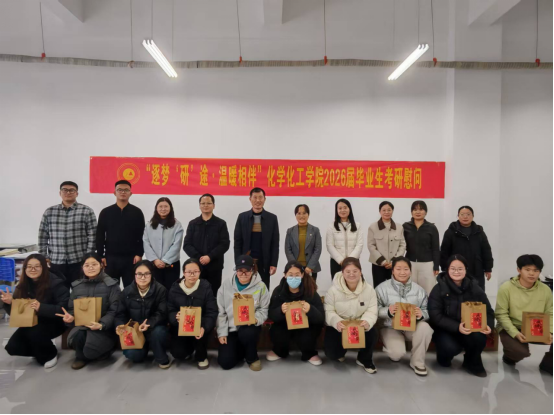 为助力2026届考研学子全力冲刺备考,缓解备考压力,营造温暖有序的应考氛围,12月17日,化学化工学院组织开展“逐梦‘研’途·温暖相伴”考研慰问活动,为即将走进考场的考研学子送去学院的关怀与祝福。学院领导班子成员、全体辅导员及班主任代表共同参加活动。