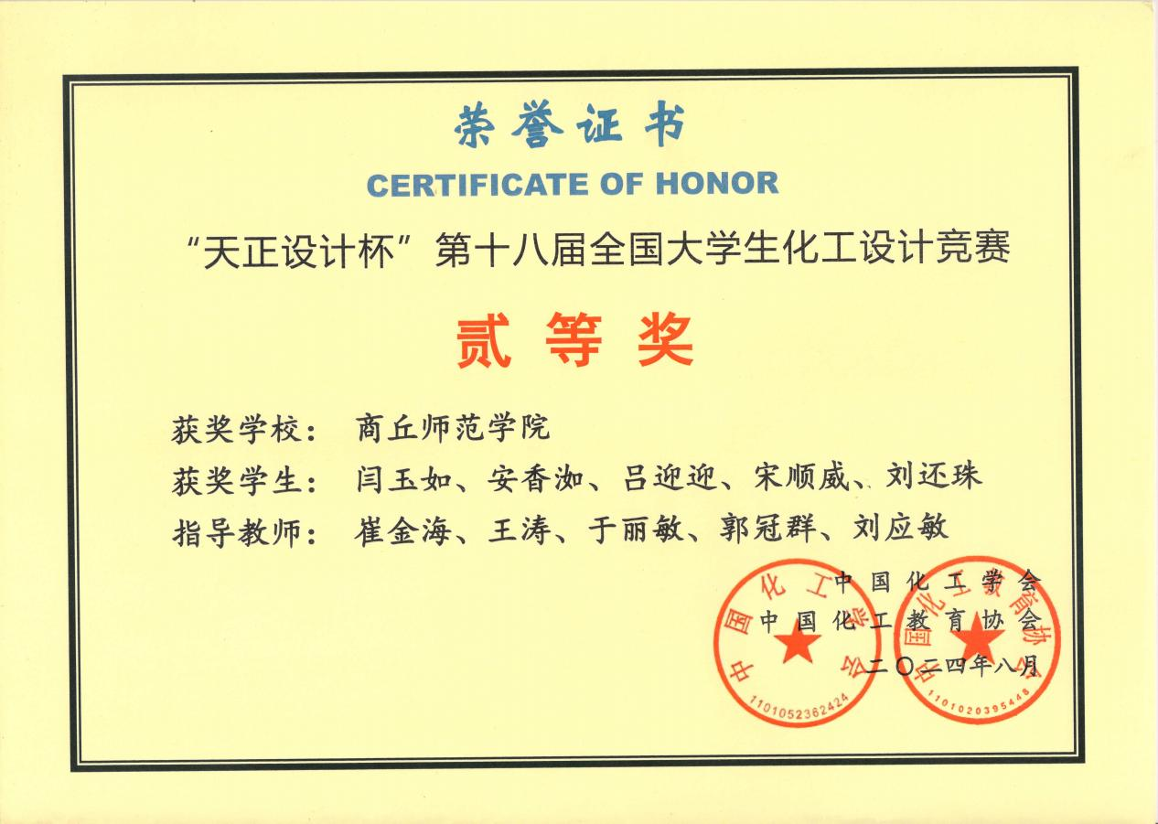 近期,由中国化工学会、中国化工教育协会联合主办的2024年“汇泰•欧倍尔杯”第十八届全国大学生化工设计竞赛全国总决赛圆满落幕。经过激烈角逐,永利23411集团由闫玉如、安香洳、吕迎迎、宋顺威、刘还珠五名学生组成“醇臻生产队”在崔金海等老师的指导下再创佳绩,荣获“天正设计杯”第十八届全国大学生化工设计大赛二等奖。