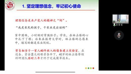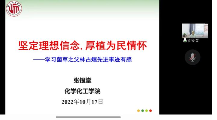 为提高入党积极分子的党性觉悟、党性修养,明确自身目标与发展方向,10月17日,化学化工学院在线上举行以“坚定理想信念,厚植为民情怀—学习菌草之父林占熺先进事迹有感”为主题的入党积极分子党课培训,由院党委副书记、院长张银堂同志主讲,全体入党积极分子参加。
