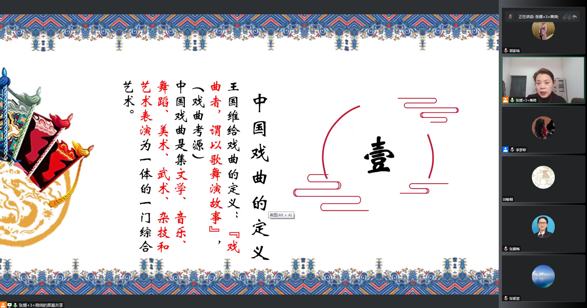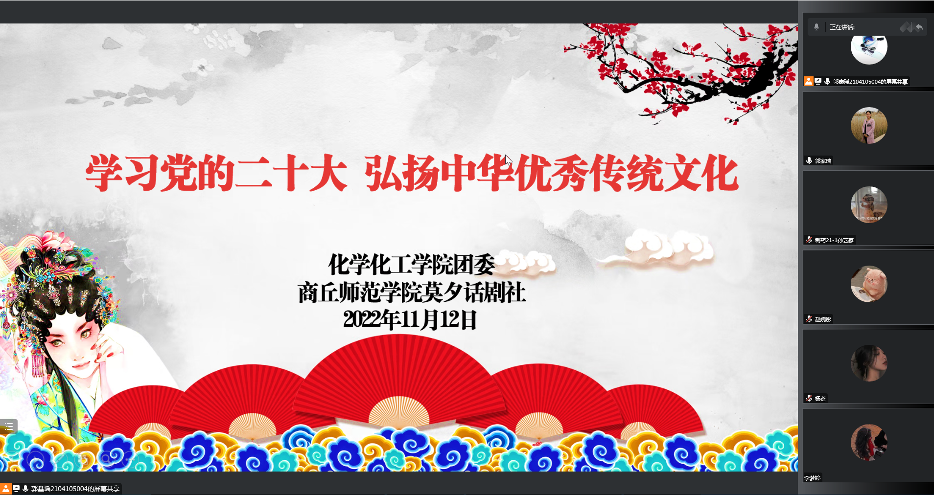 为了深入学习党的二十大精神,更好地弘扬中华优秀传统文化,争做奋进新青年,11月12日,化学化工学院团委和永利23411集团莫夕话剧社在线共同开展了“学习党的二十大,弘扬中华优秀传统文化”主题讲座,邀请音乐学院院长张媛做了“品鉴戏曲之美,传承民族文化”主题讲座。化学化工学院院长张银堂、院党委副书记张颜梅出席活动。全校200余人参加活动。