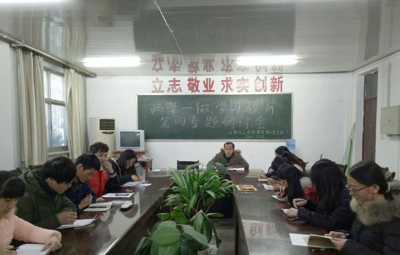 根据校“两学一做”学习教育工作安排,11月23日,化学化工学院学生第二、第三党支部分别在院会议室召开了“两学一做”第四专题学习研讨会。党支部书记李可刚和辅导员刘双博士出席了会议,党支部全体成员参加了会议,会议由李可刚老师主持。