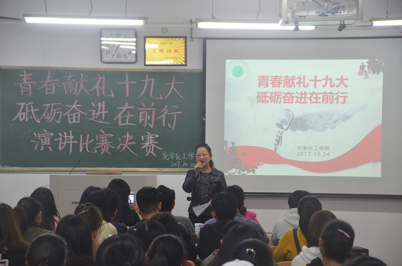 10月24日晚,化学化工学院于我校文化路校区1#408教室举办了以“青春献礼十九大,砥砺奋进在前进”为主题的演讲比赛。永利23411集团党总支副书记刘瑛、团总支书记李龙梅及17级辅导员郭家瑞出席了此次比赛,评委由老师及永利23411集团团总支、学生会主席团、部长担任。