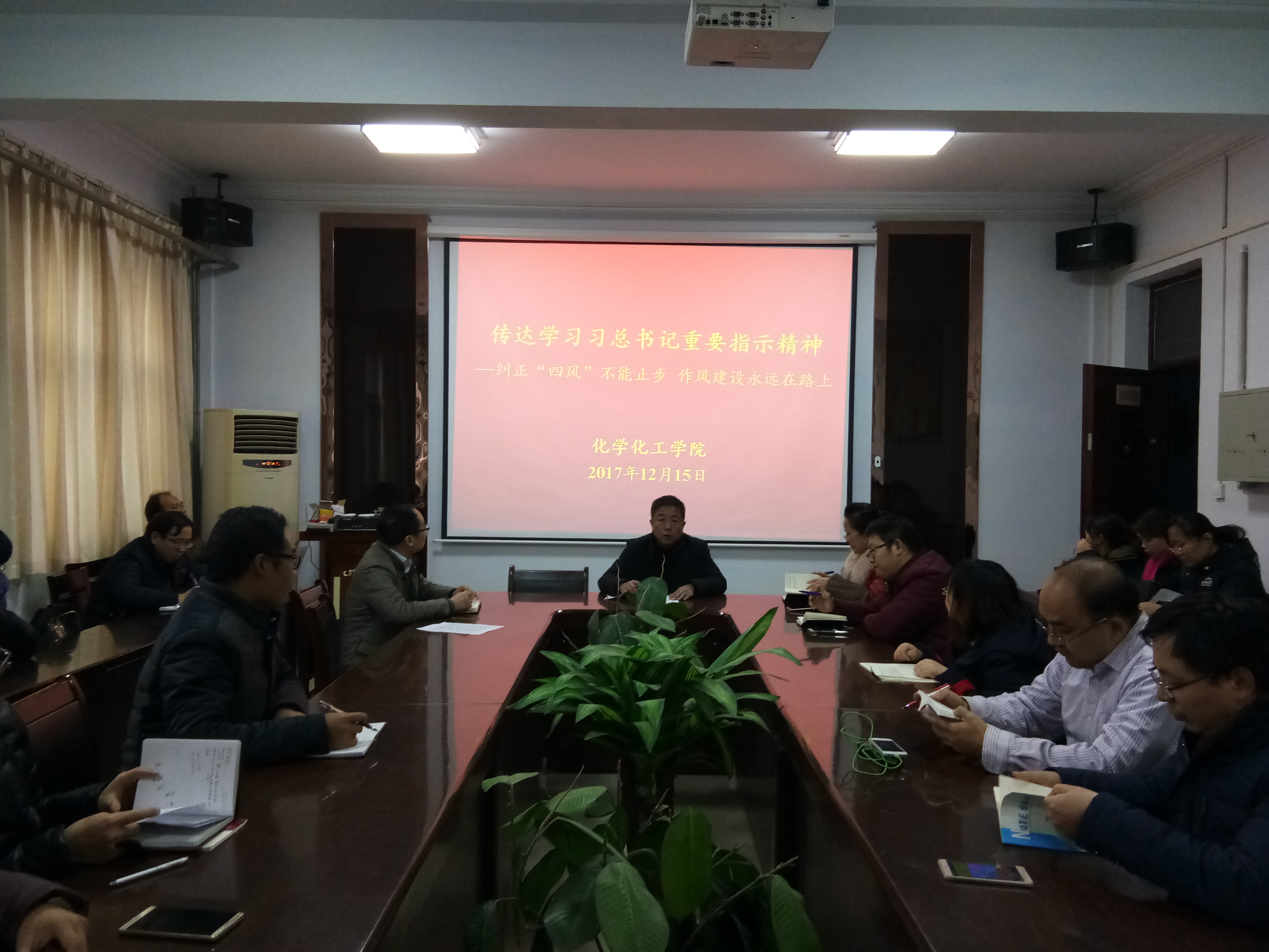 12月15日,化学化工学院于我校文化路校区7号楼会议室召开“传达学习习近平总书记重要指示―纠正‘四风’不能止步,作风建设永远在路上”专题学习会议。院党总支书记韩忠民、副书记刘瑛、副院长孟团结出席了此次会议,会议由院党总支书记韩忠民主持。