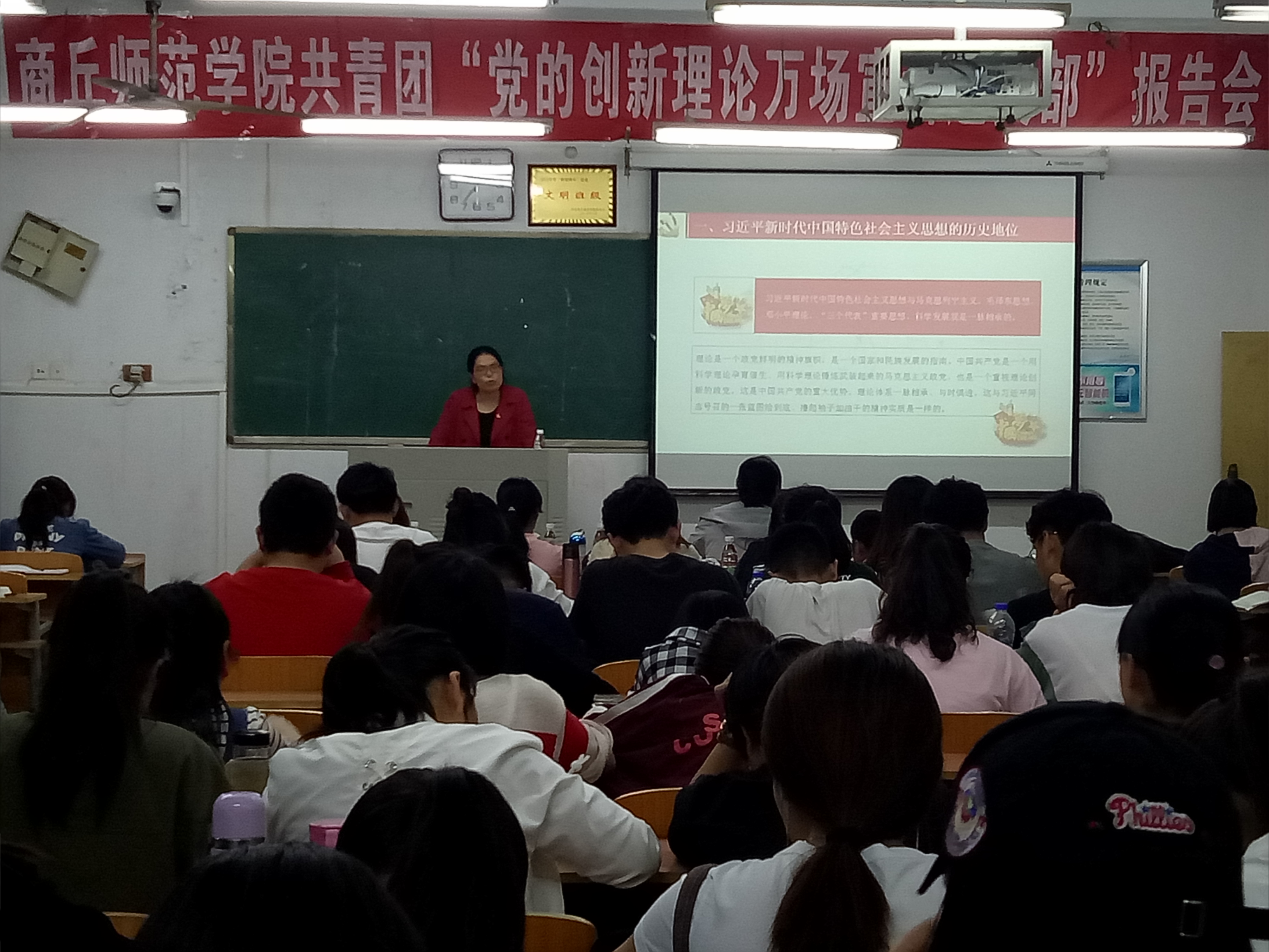 首先,李龙梅老师为大家简单介绍了介绍了党的创新理论万场宣讲进支部活动开展的背景。随后,董若颖老师就习近平新时代中国特色社会主义思想形成的背景、历史地位、重大意义和丰富内涵为大家展开了声情并茂的演讲。并指明习近平新时代中国特色社会主义思想是党的十九大的灵魂;是党的十九大的一个历史性决策和最重要的贡献;体现了我们党在理论上的高度成熟、高度自信,反映了全党共同意志和全社会共同意愿。报告最后,董老师和同学们进行互动,提出一些有关“十九大”的小问题,同学们表现的十分积极,现场气氛十分活跃。