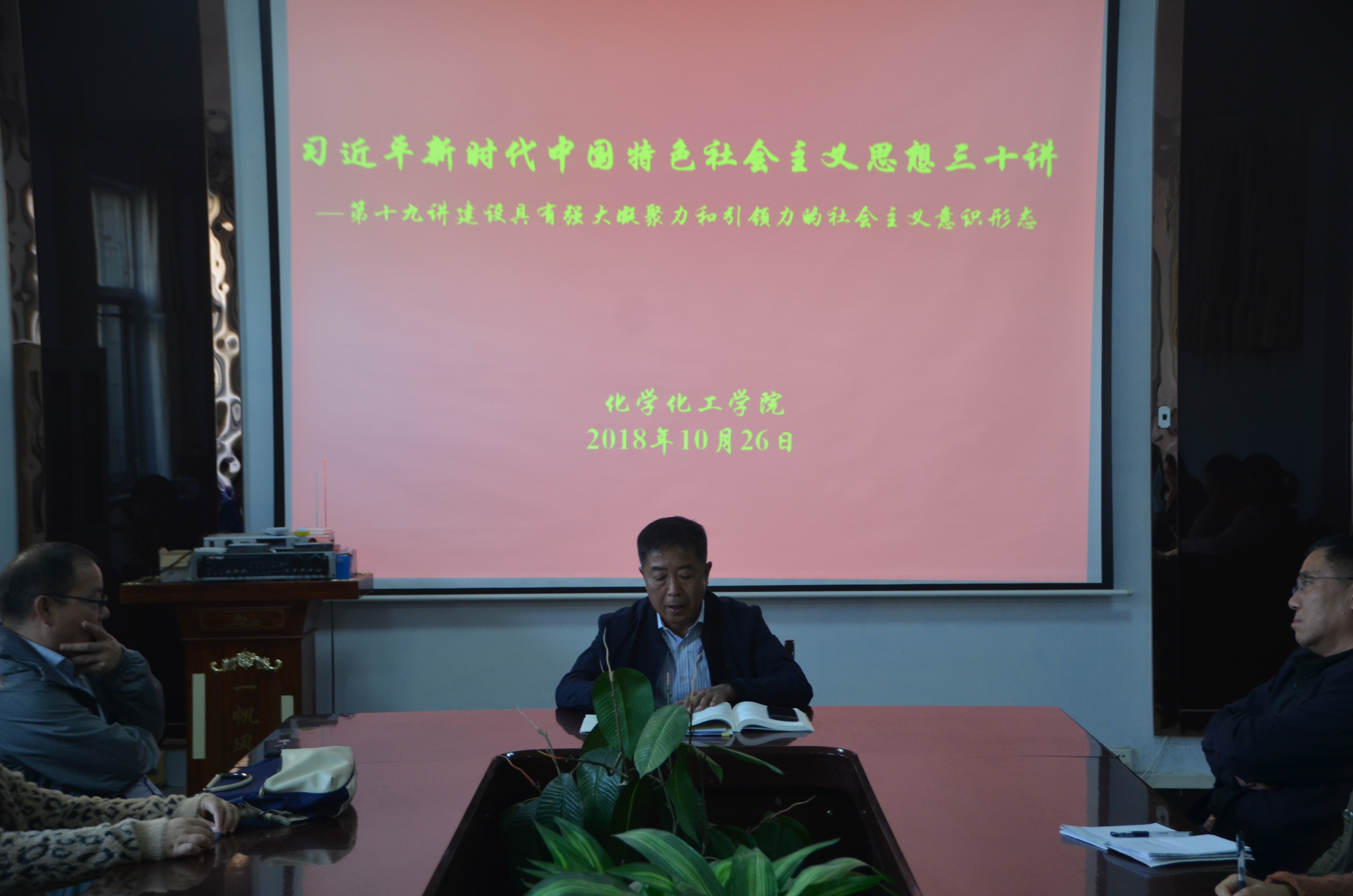 10月26日下午,化学化工学院于睢阳校区7号楼会议室召开《习近平新时代中国特色社会主义思想三十讲》学习会议。全体教职工参加会议,院党总支书记韩忠民主持。