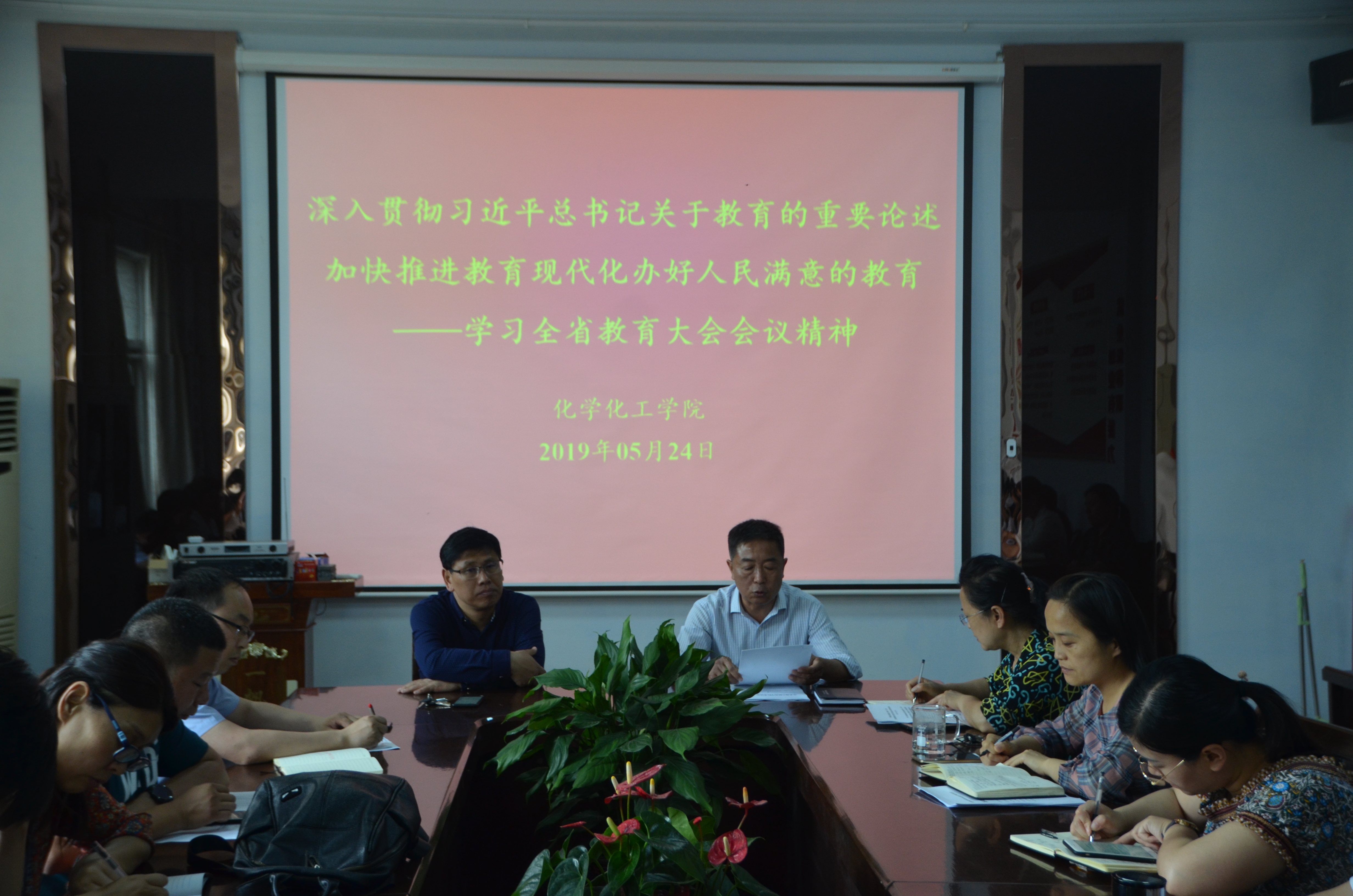 为了深入学习贯彻习近平总书记关于教育的重要论述和全国教育大会精神,动员全院围绕立德树人这一根本任务,强措施、补短板、提质量,加快推进教育现代化,5月24日下午,化学化工学院于睢阳校区7号楼会议室内召开了传达全省教育大会的主题会议,全体教职工参加会议,党总支书记韩忠民主持会议。