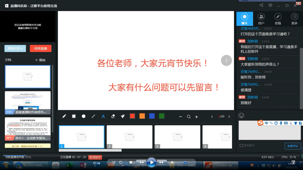 培训持续近两个小时,任课老师与刘新明老师积极互动交流,气氛活跃。老师们纷纷留言,表示刘老师讲解得简明扼要,干货满满,受益匪浅,通过这次培训原来一直担心的线上授课这个拦路虎也没那么难了,对保证在这个非常时期的教学进度、教学质量充满了信心。
