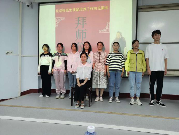 为进一步加快化学专业师范生专业成长步伐,着力打造一支师德高尚、业务精良的高素质教师队伍,9月25日下午,化学化工学院在我校睢阳校区1308教室举行化学专业“互联网+”师范生教学技能培养工作坊拜师仪式。化学化工学院党总支书记韩忠民,化学化工学院副院长孟团结,10位工作坊坊主,班主任张南老师及全体学员参加了仪式。会议由化学系主任韦秀华老师主持。